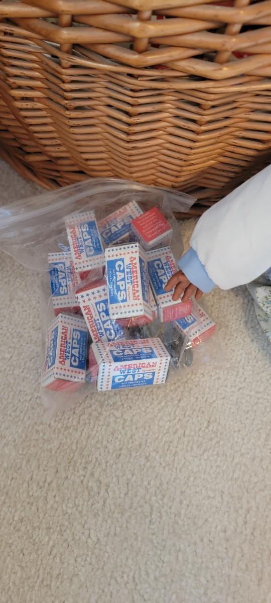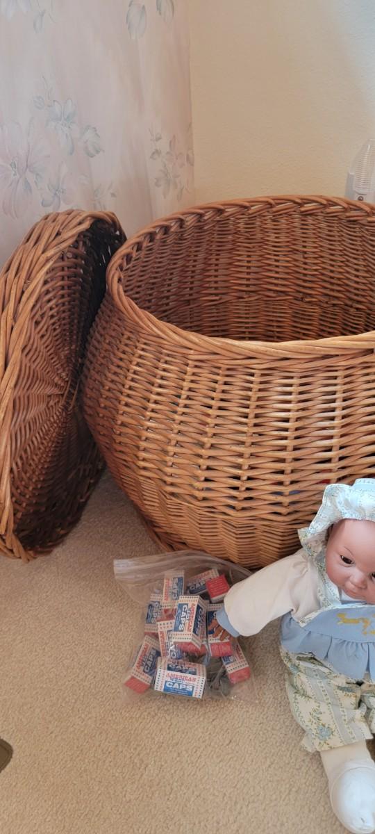 Large wicker basket with toys...and caps!!