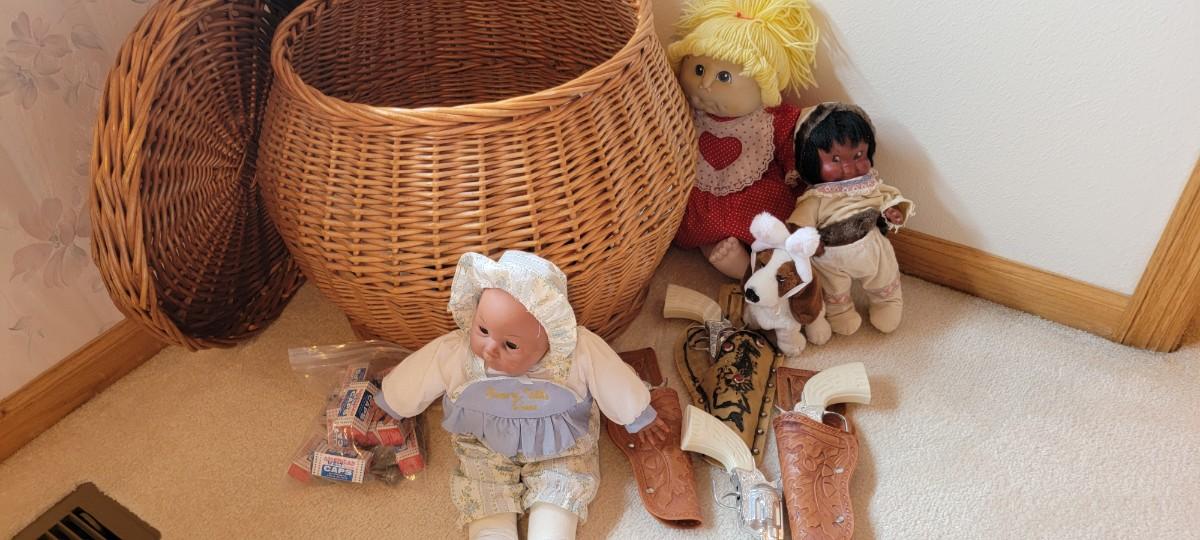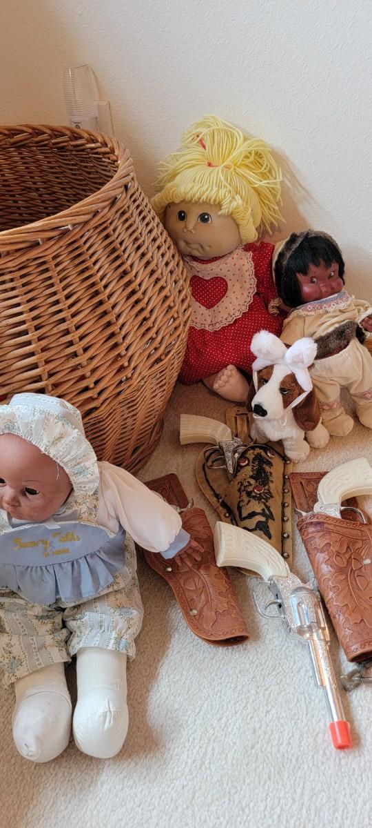 A44 -Vintage cap guns, Cabbage Patch, Indian doll, toys, large covered basket