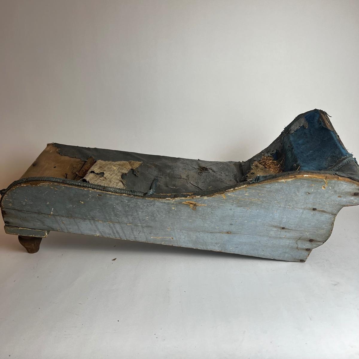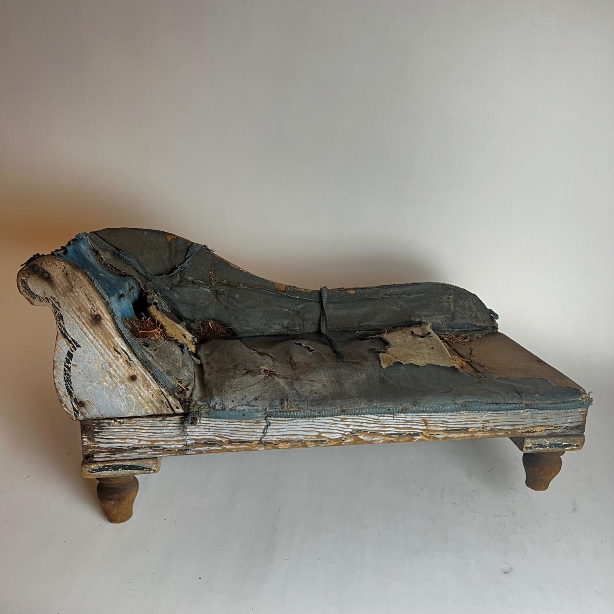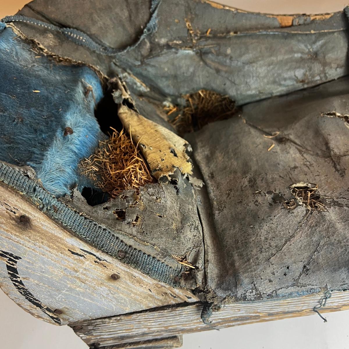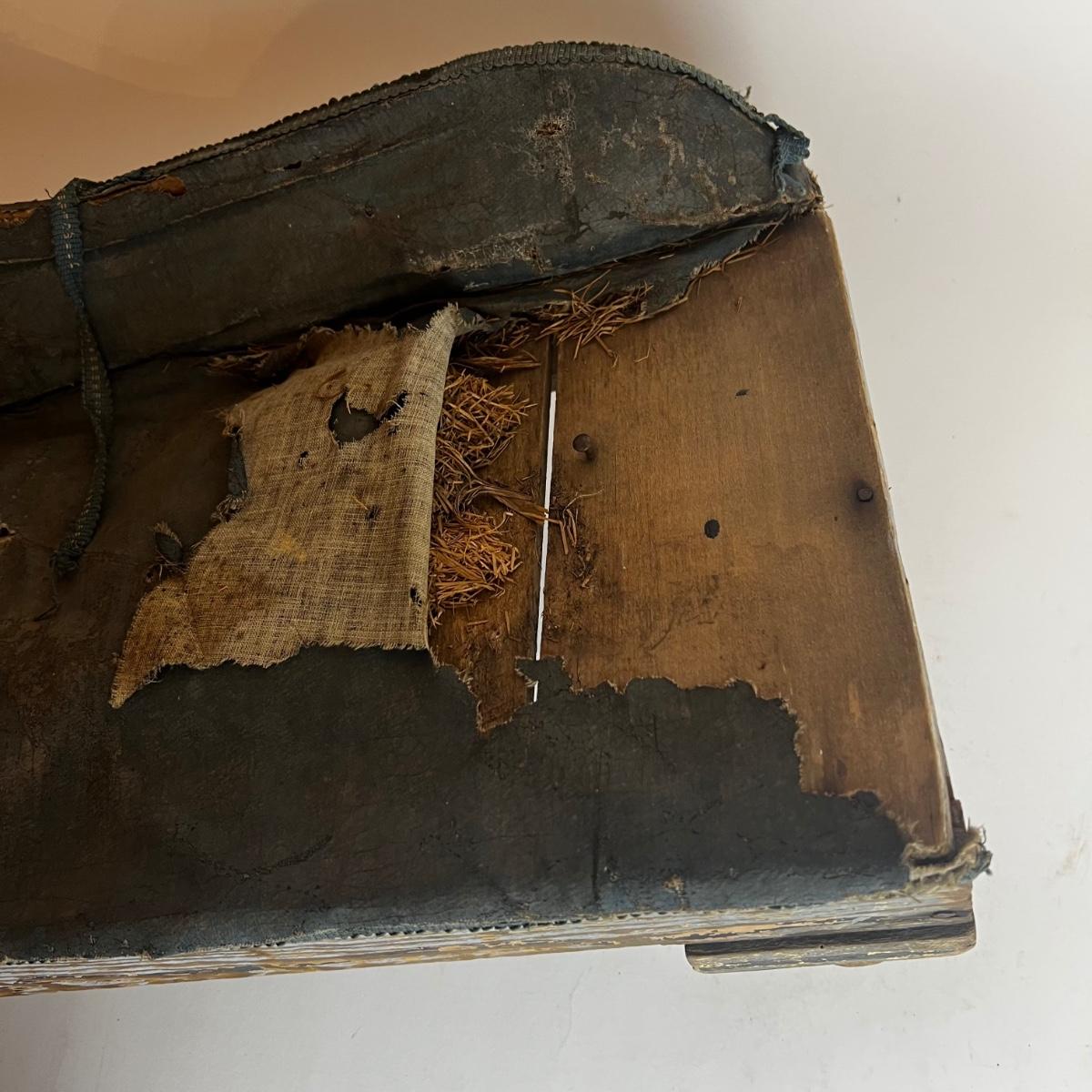 Is missing a back leg, stuffed with hay, the upholstery is damaged. Measures 24”L x 10”W
