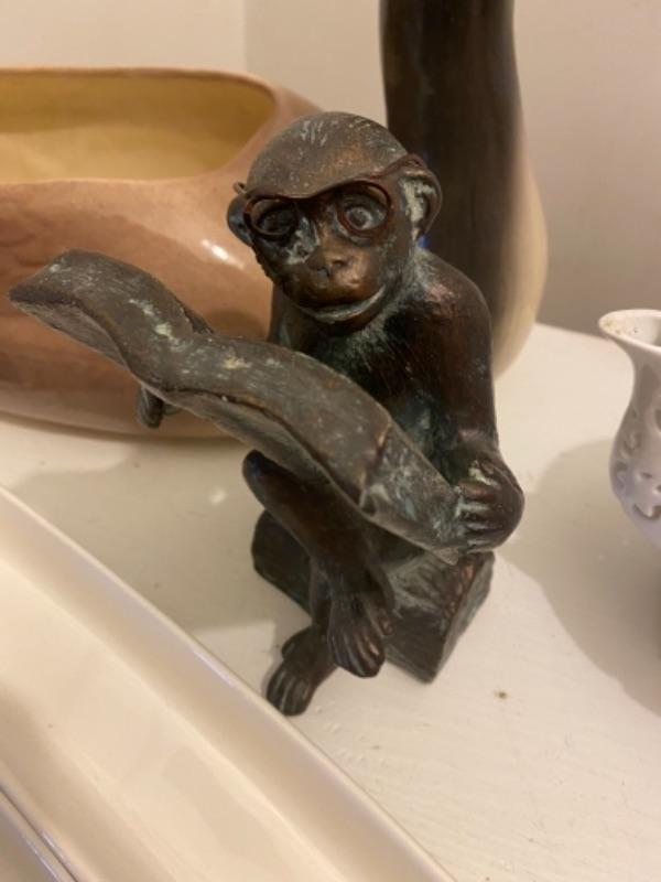 Miscellaneous decorative items with teapot votive, olive dishes, heavy monkey book and, goose porcelain planter