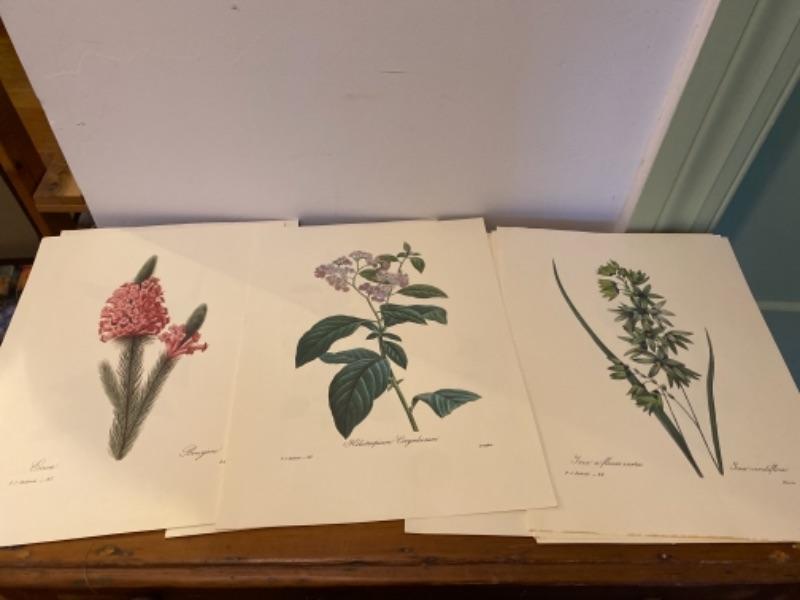 Antique single drawer stand measuring 26.5 inches wide by 15.5 inches deep by 24.25 inches tall with 11 flower and fruit prints