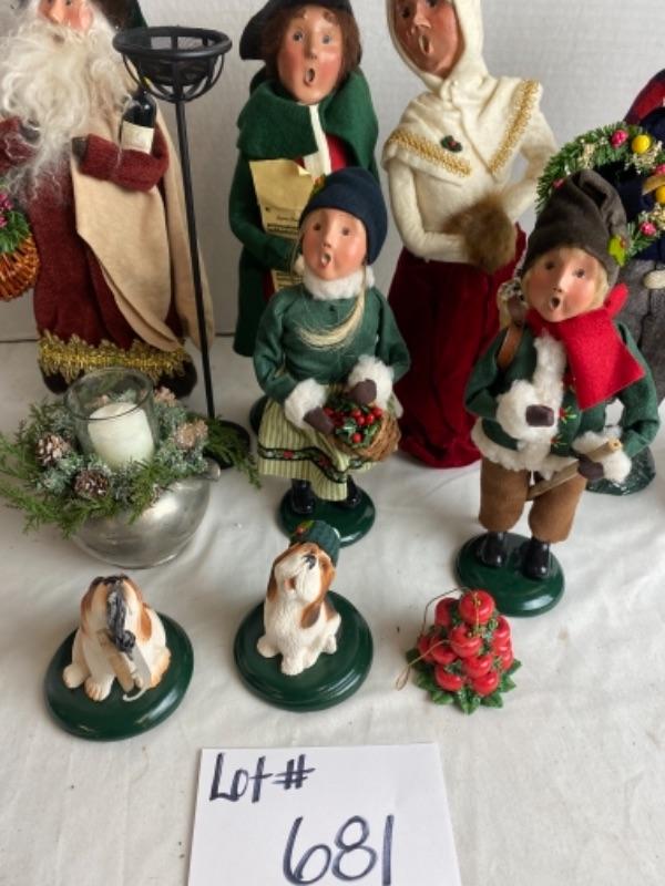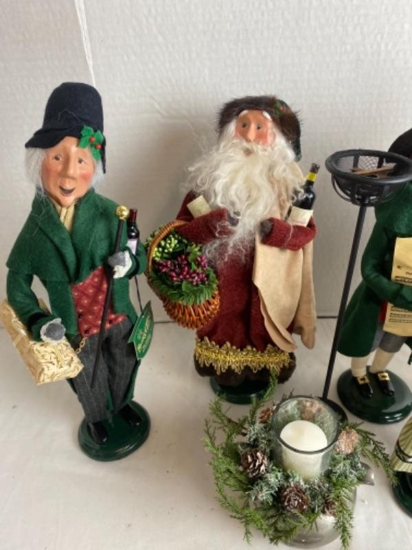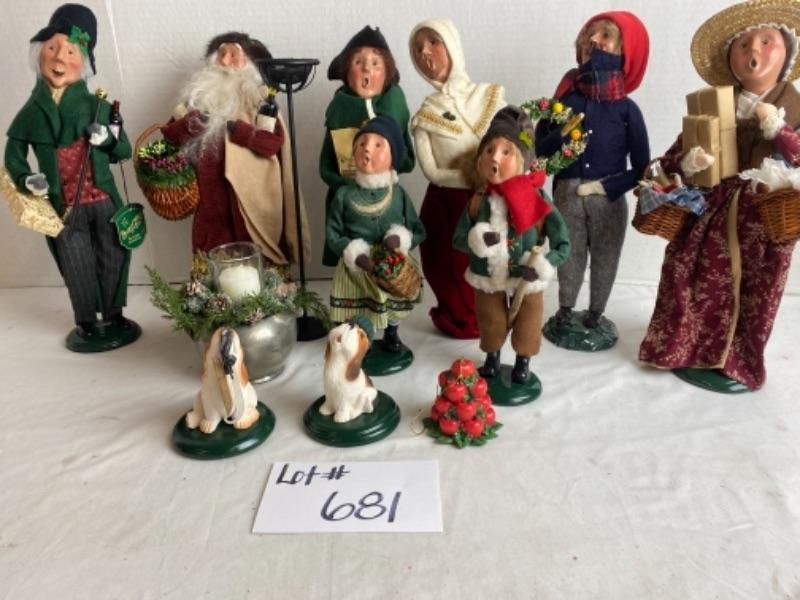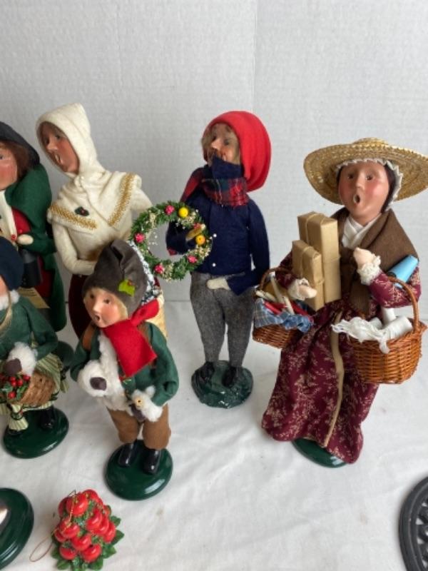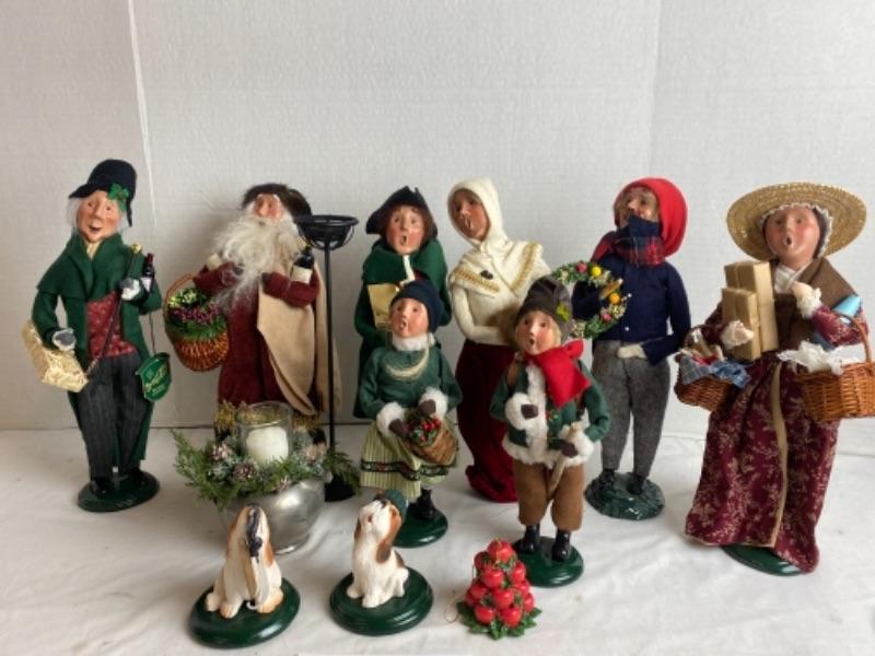 Set of 8 Byers choice carolers with two Byers voice dog statue with apple ornament and pewter arrangement
