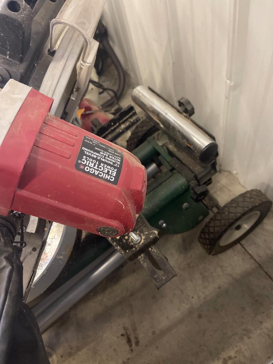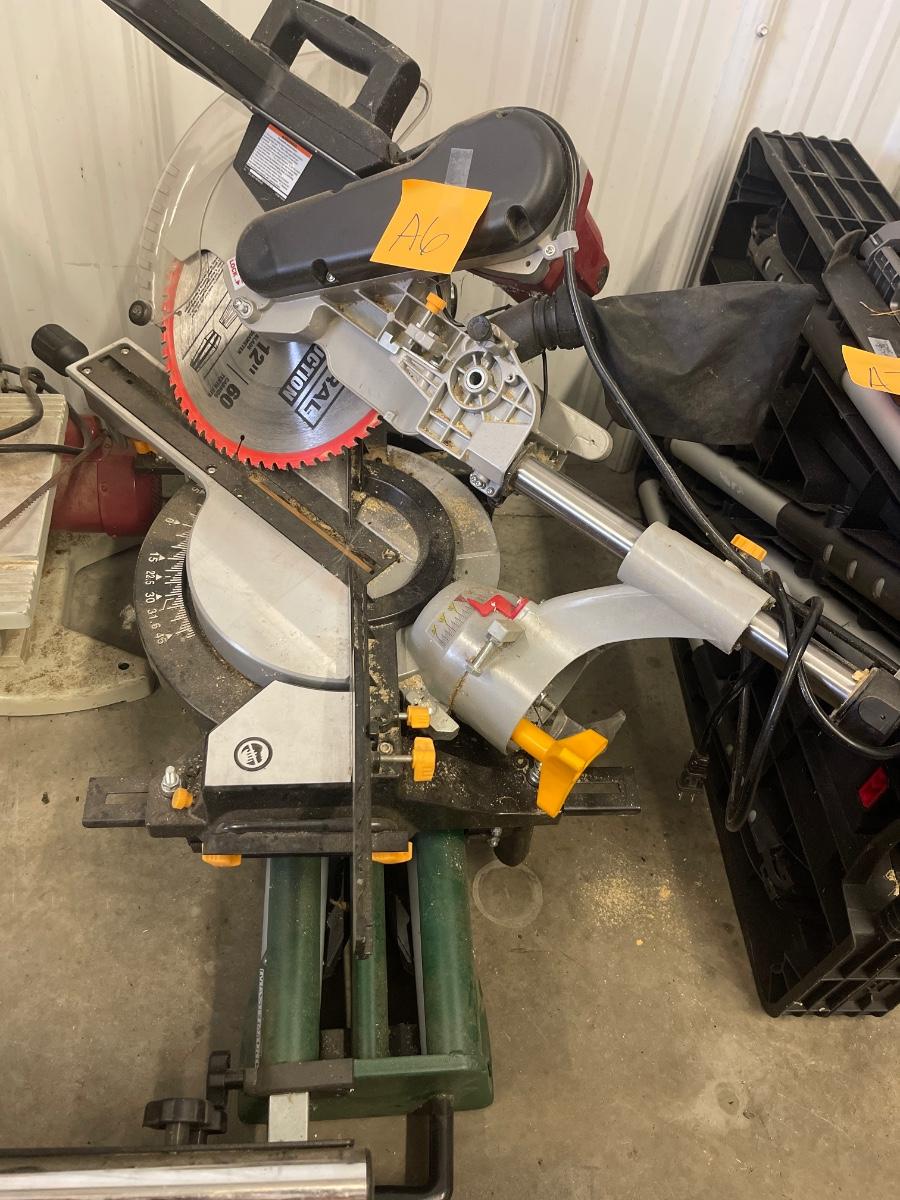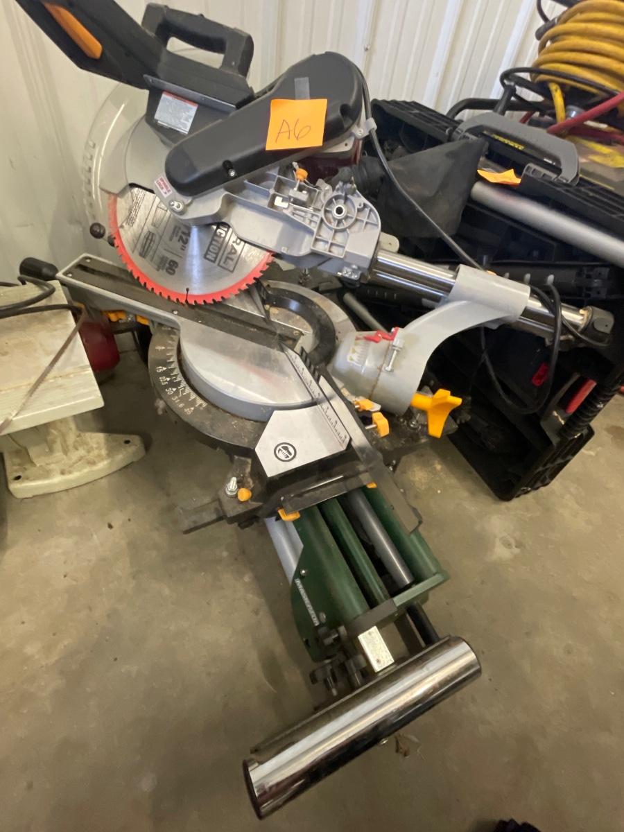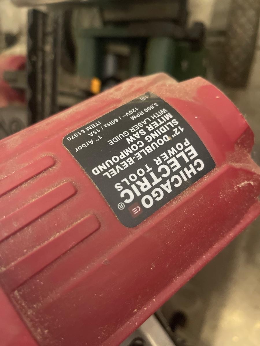 A6-Chicago electric 12 inch double bevel sliding compound miter saw and Masterforce work table