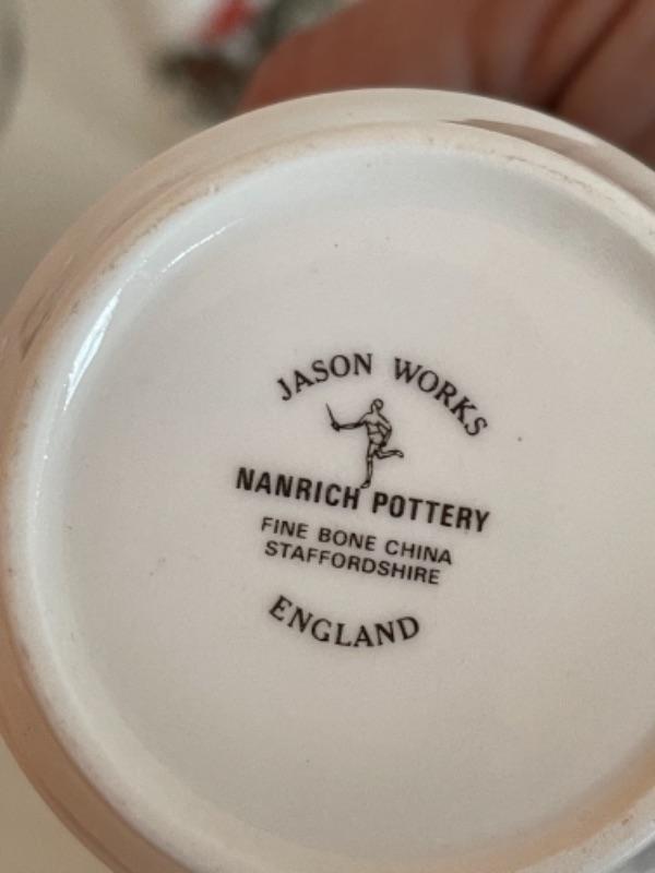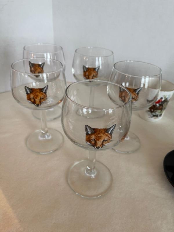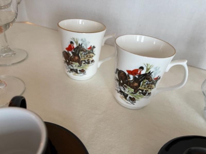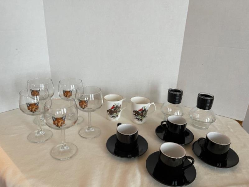 Set a five fox stem ware, pair of equestrian coffee mugs by Jason works, four sets of cups and saucers, and two carafes