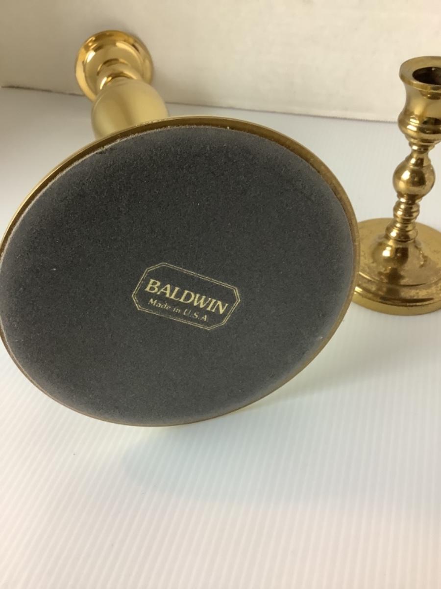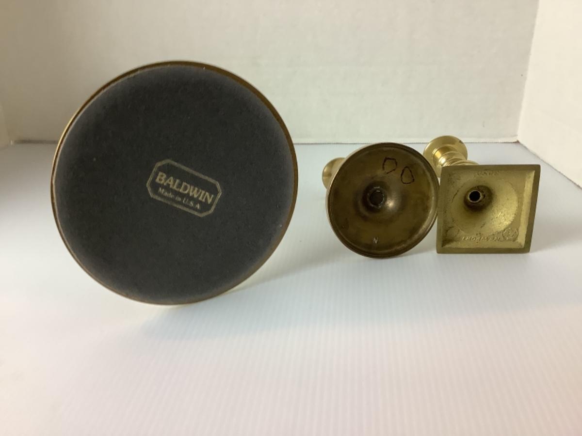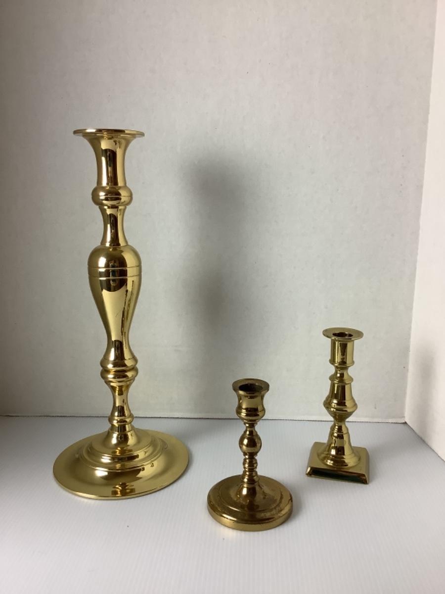 14” Baldwin candlestick , 6” Williamsburg candlestick and 5” brass -no marks