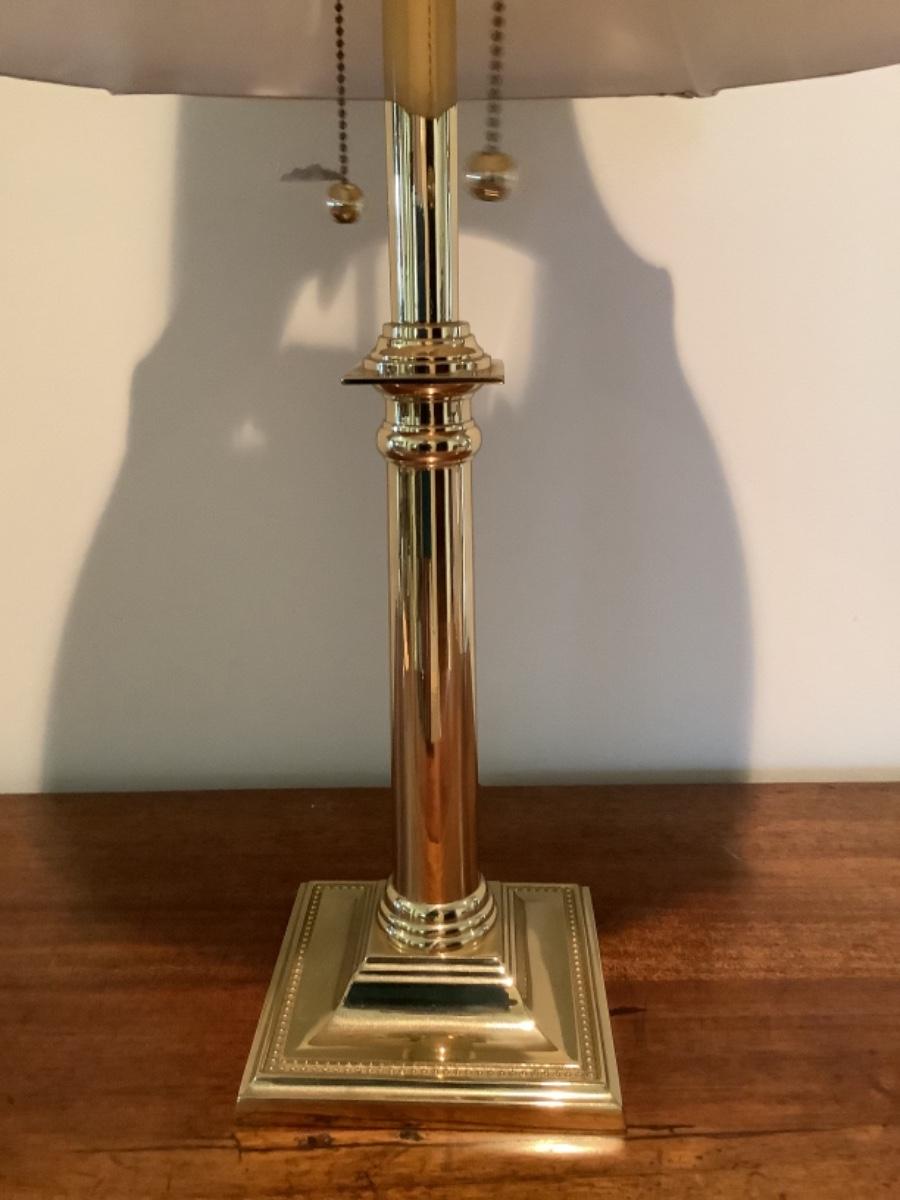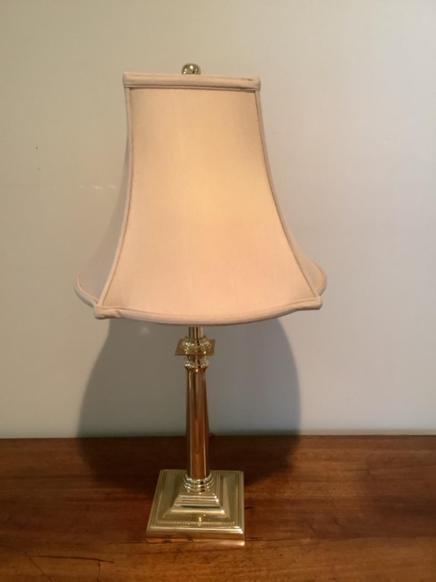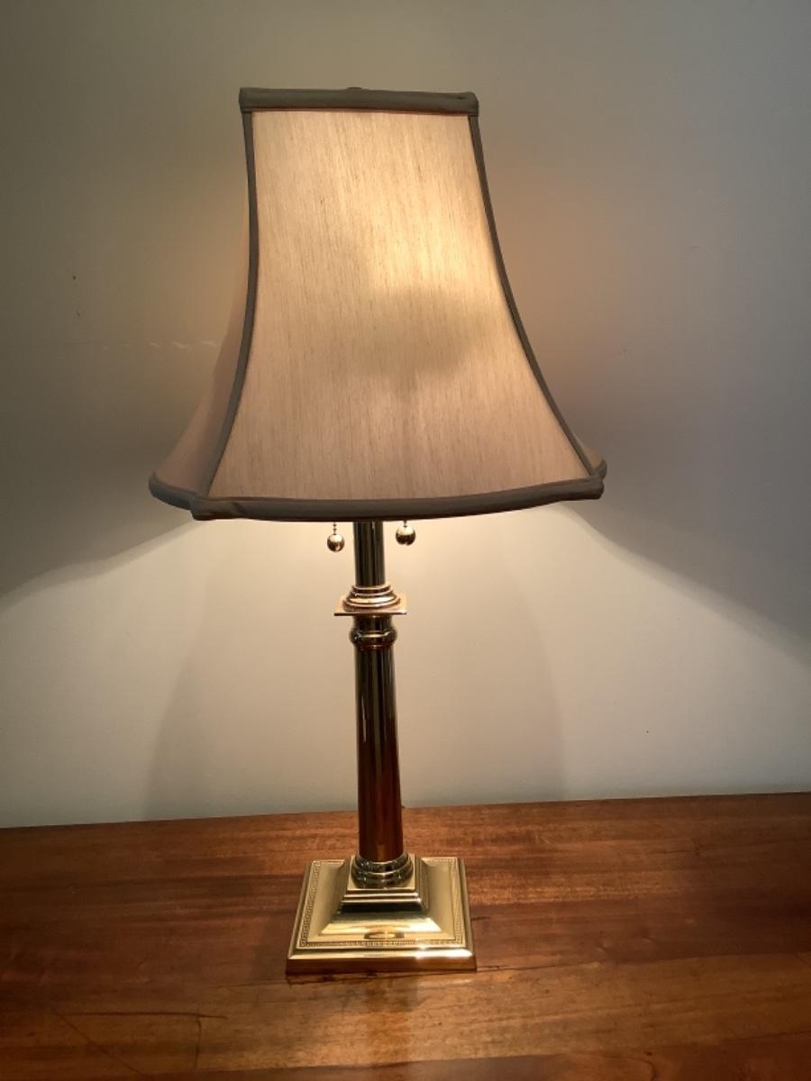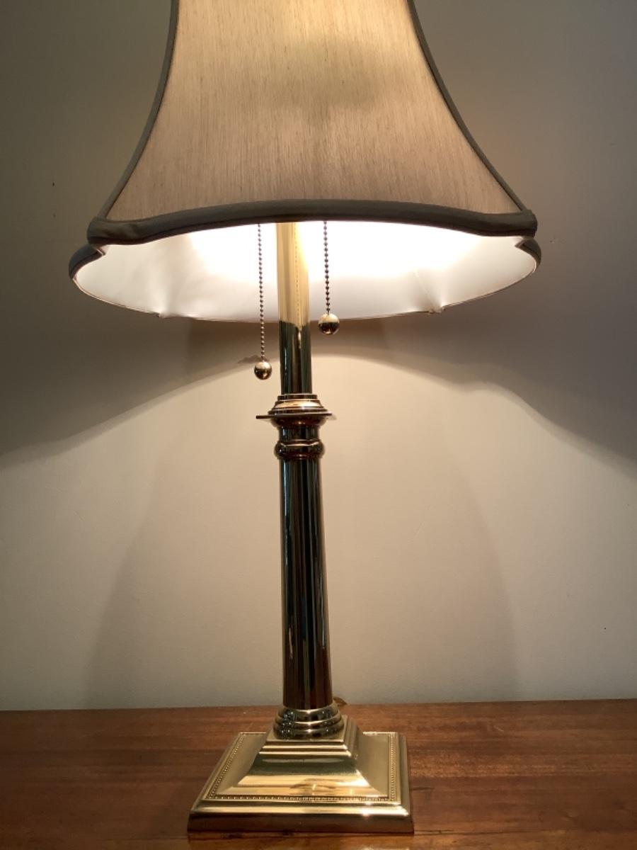 Lamp measures 26” high with shade (shade has tear on inside) base measures 6” square. It also has two bulbs with two pull chains