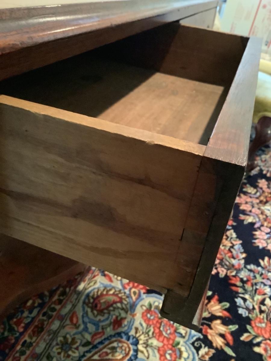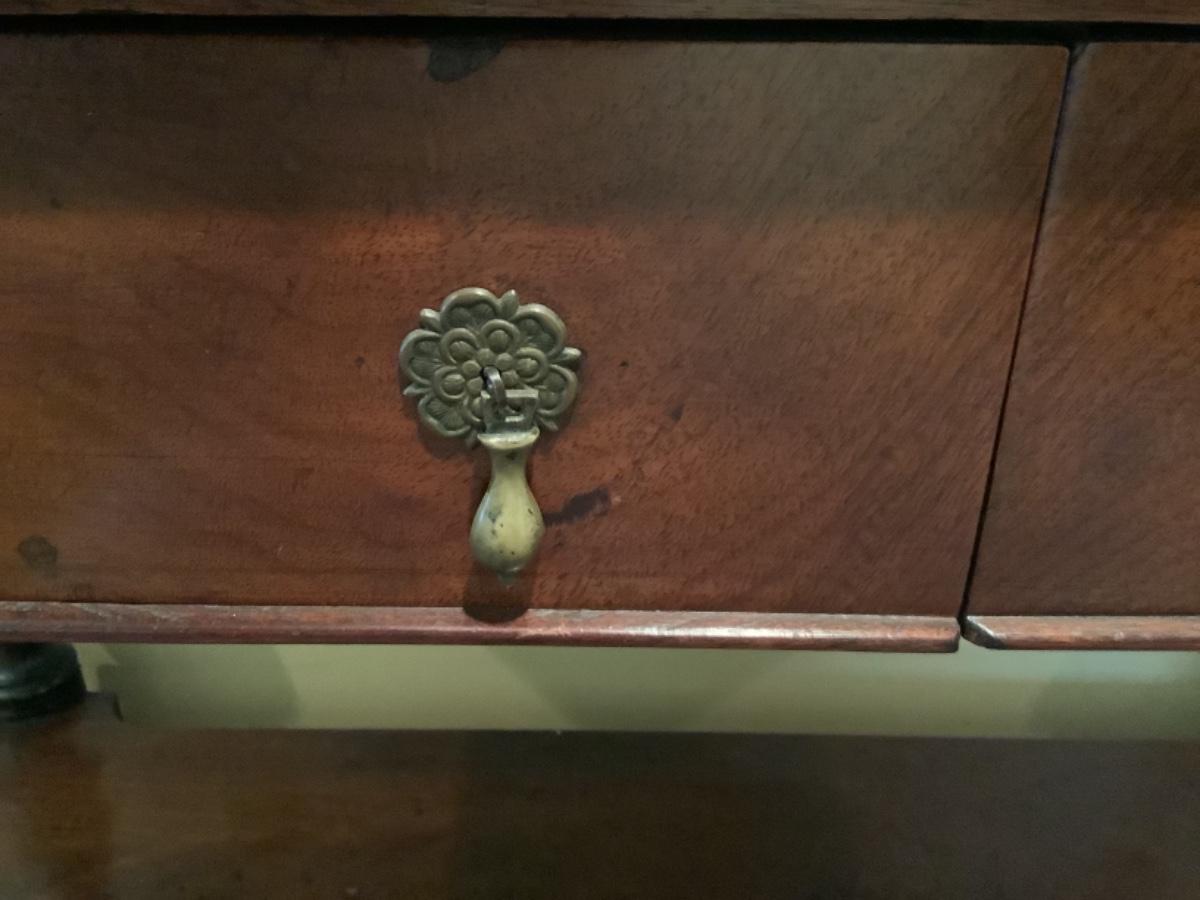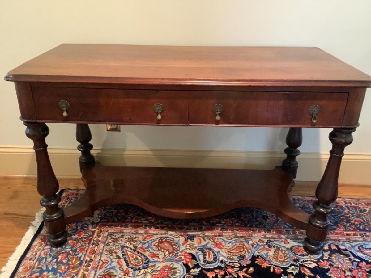 Two drawer walnut Writing Desk with teardrop pulls and bottom shelf
