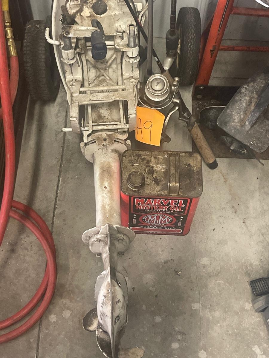 A9- Johnson 4 motor, Marvel Mystery Oil and 3 fishing rods