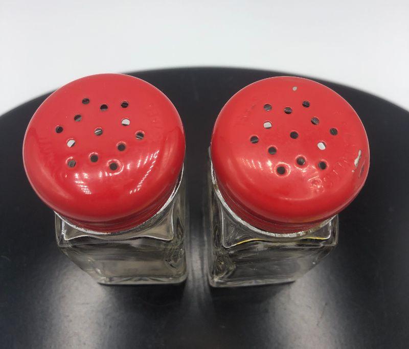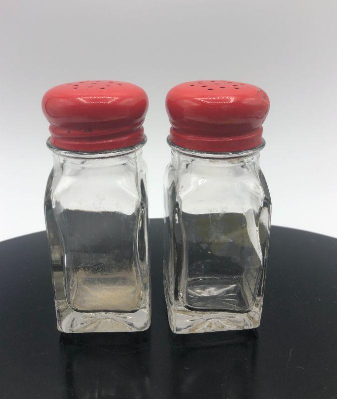 Diner-style salt and pepper shaker set. Solid clear glass with red-painted stainless steel caps.