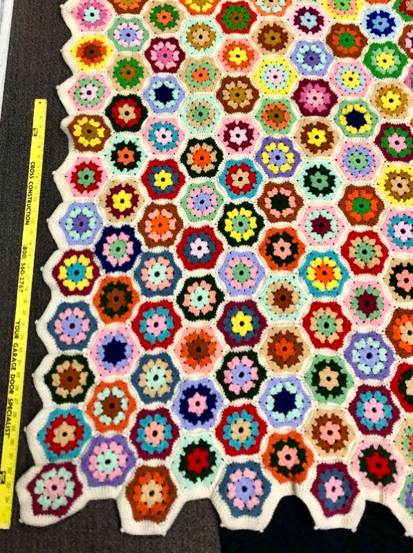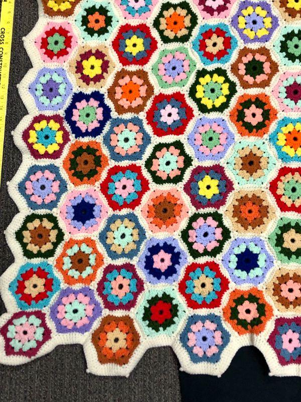 Vintage Afghan Blanket. Colorful hexagon pattern with flower like centers. Measures roughly 57"x71". No damage or spots.