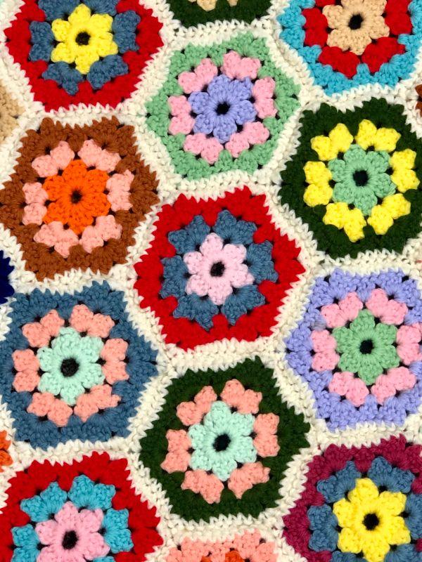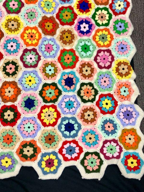 Vintage Crochet Colorful Granny Hexagon Flower Afghan Throw Blanket