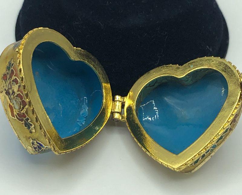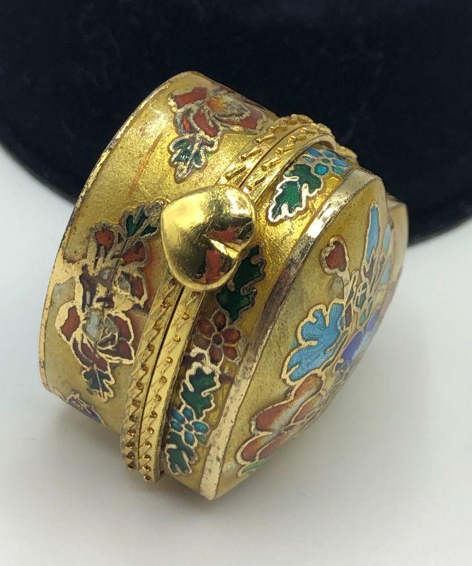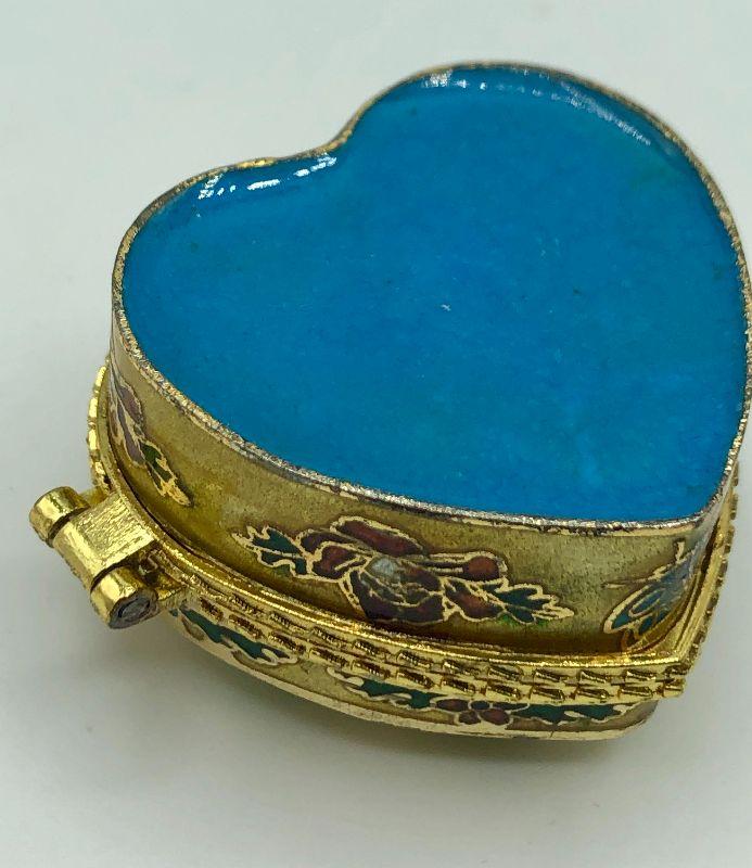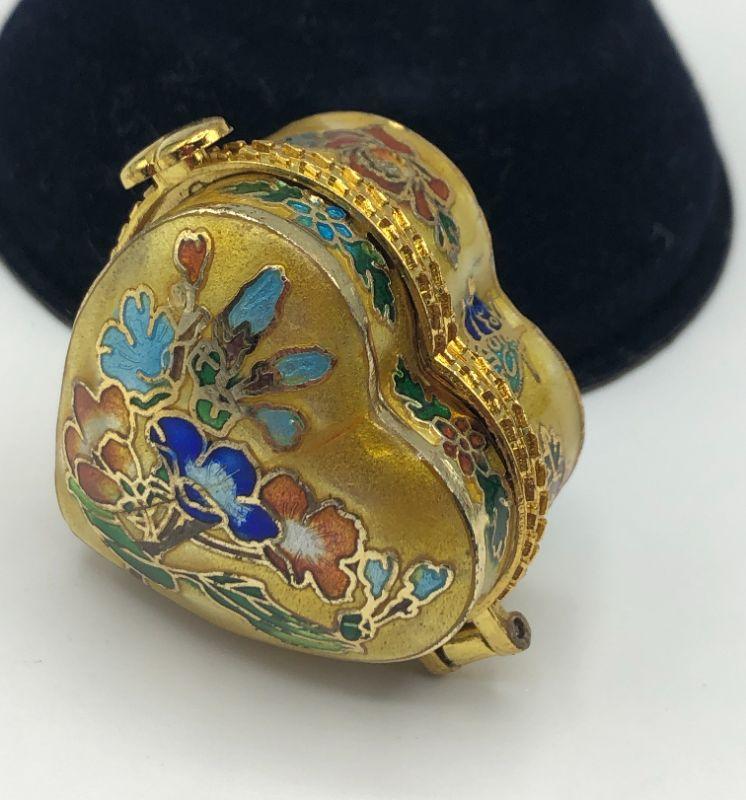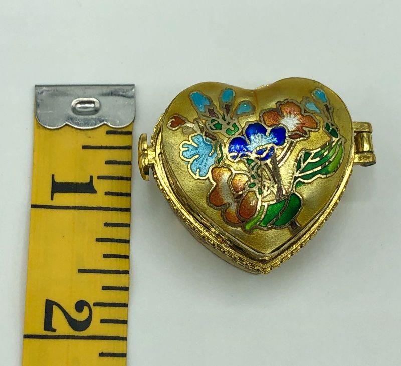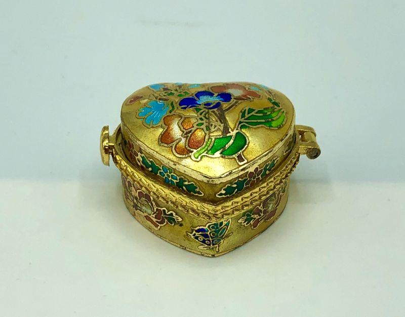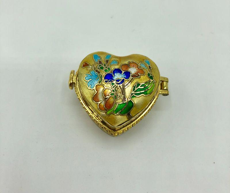 Gold Cloisonné Heart Pill Box. Small trinket box about 1.5” size. Enamel flower pattern. Does have a scratch in the top, but still looks good.