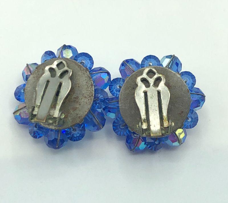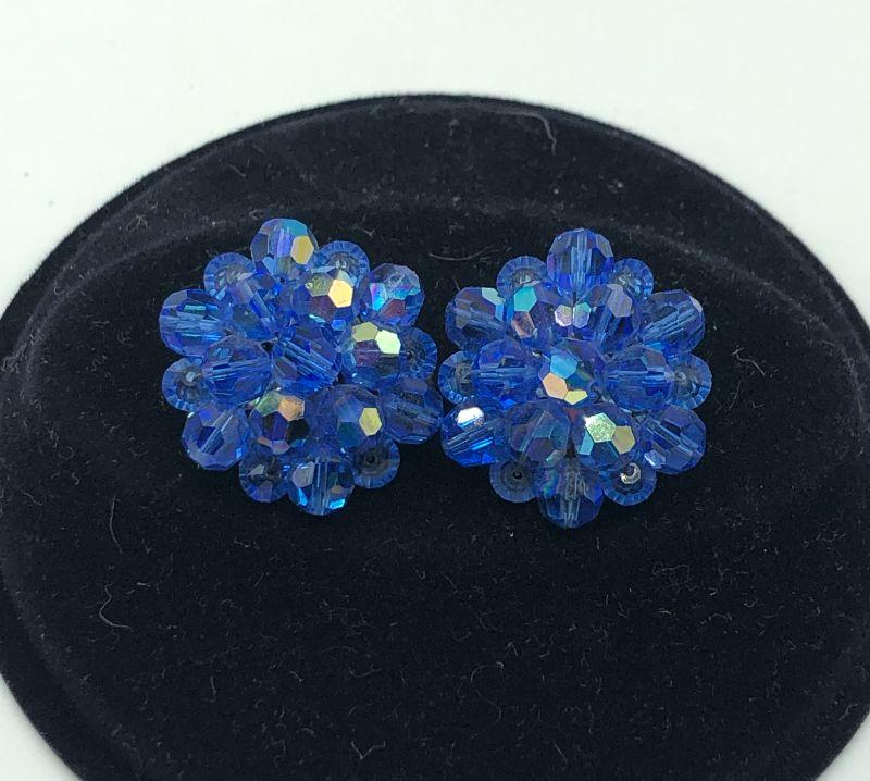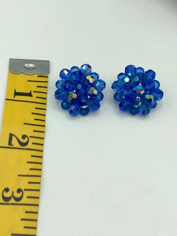 Vintage cluster earrings. Clip earrings. True blue AB beads. About 1”.
