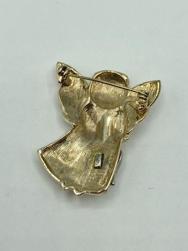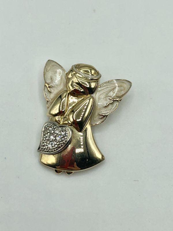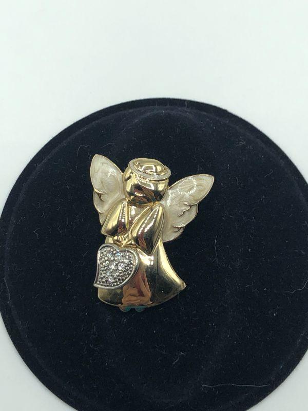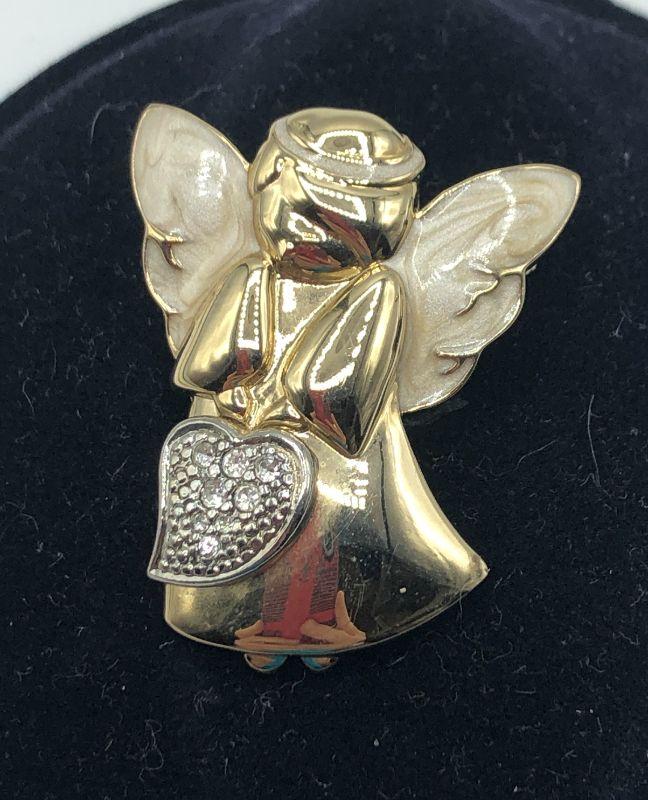Goldtone Angel holding a silvertone heart pin. Heart has a couple rhinestones to give it sparkle. Wings and halo are cover in a glittery enamel. About 1.5" length.