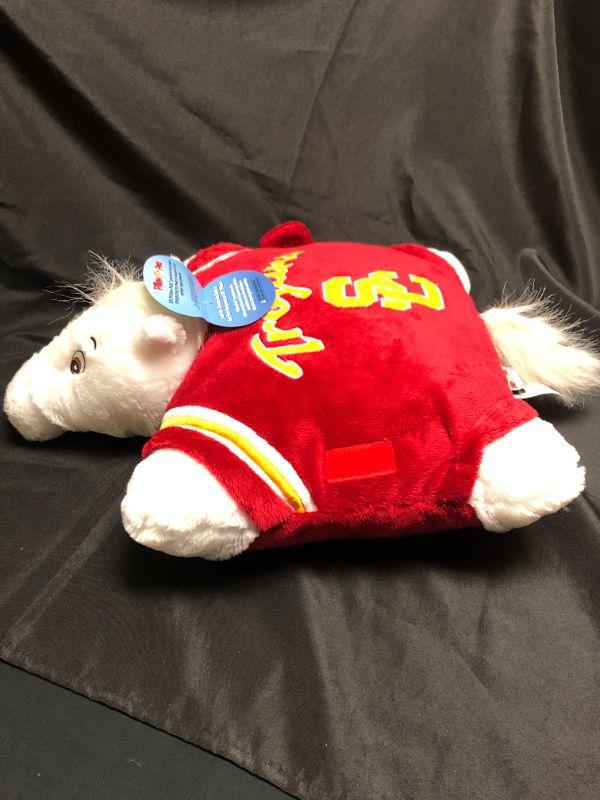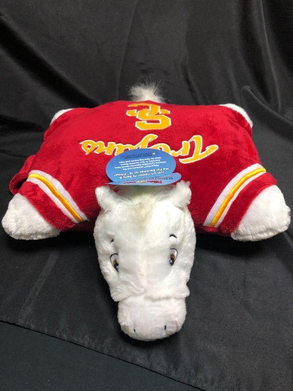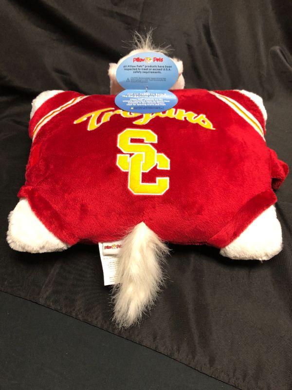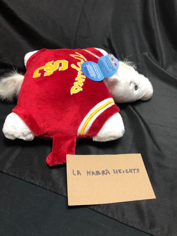 New with tag My Pillow Pet - Traveller, in a USC Trojans onesie. Measures approx 24” from nose to tip of tail, 18” wide when unstrapped and laid flat as a pillow.