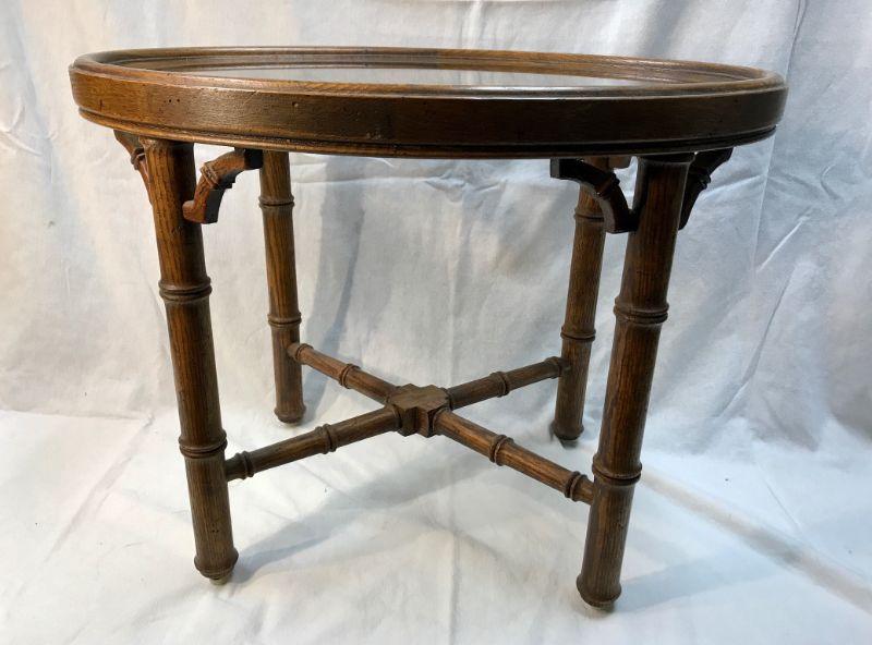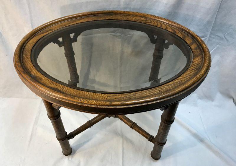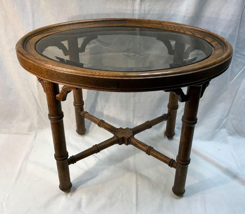 Faux bamboo oak wood glass top table. Oval shaped. Smoky beveled glass. Good condition. Measures 18"hx23"wx17".d.