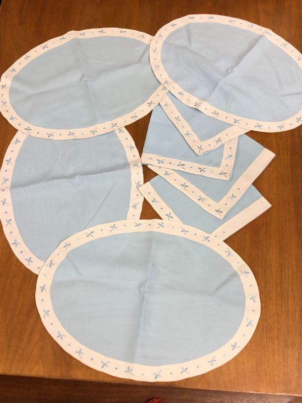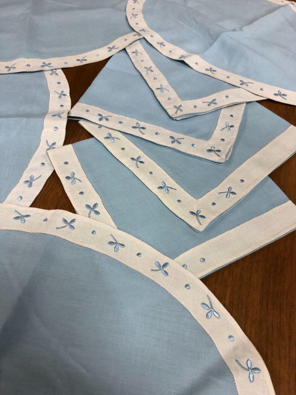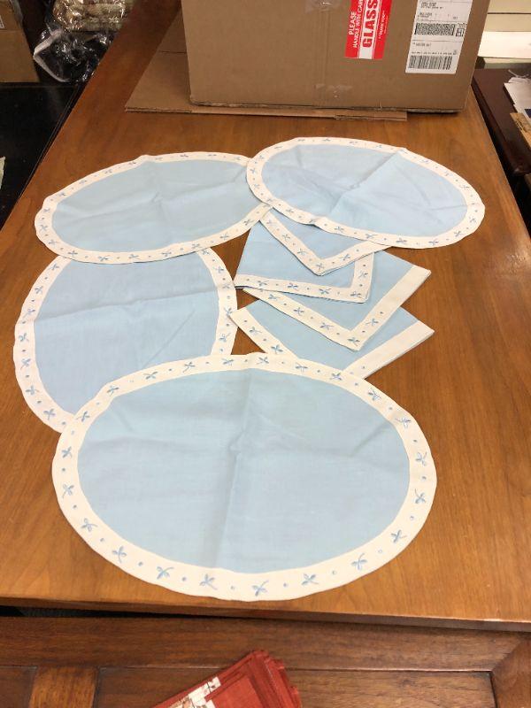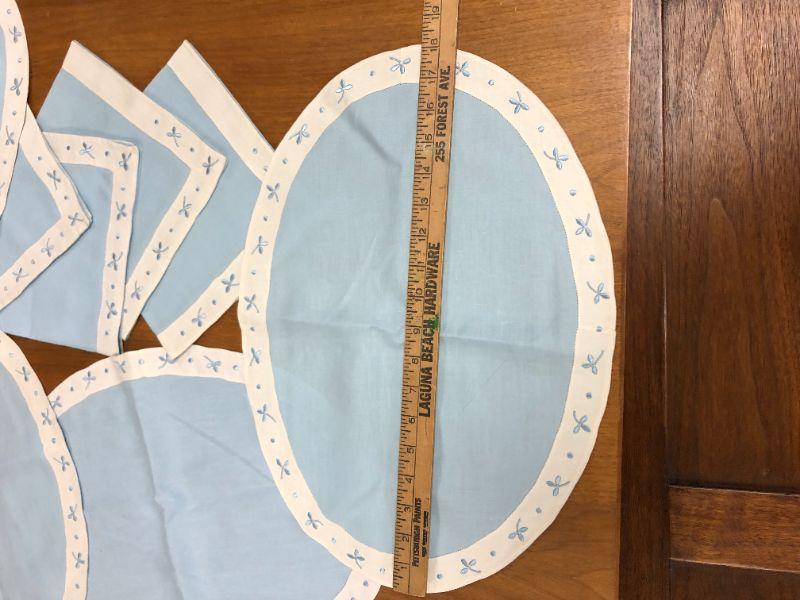 vintage linen napkins and placemats, oval, blue with white and blue border
