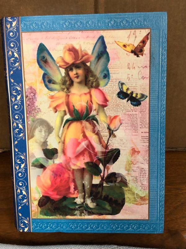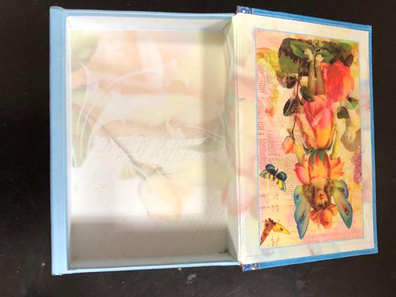 Pretty decorative box. Shaped after a book, has a flower fairy image on it. Great for hiding things amongst the book shelf.