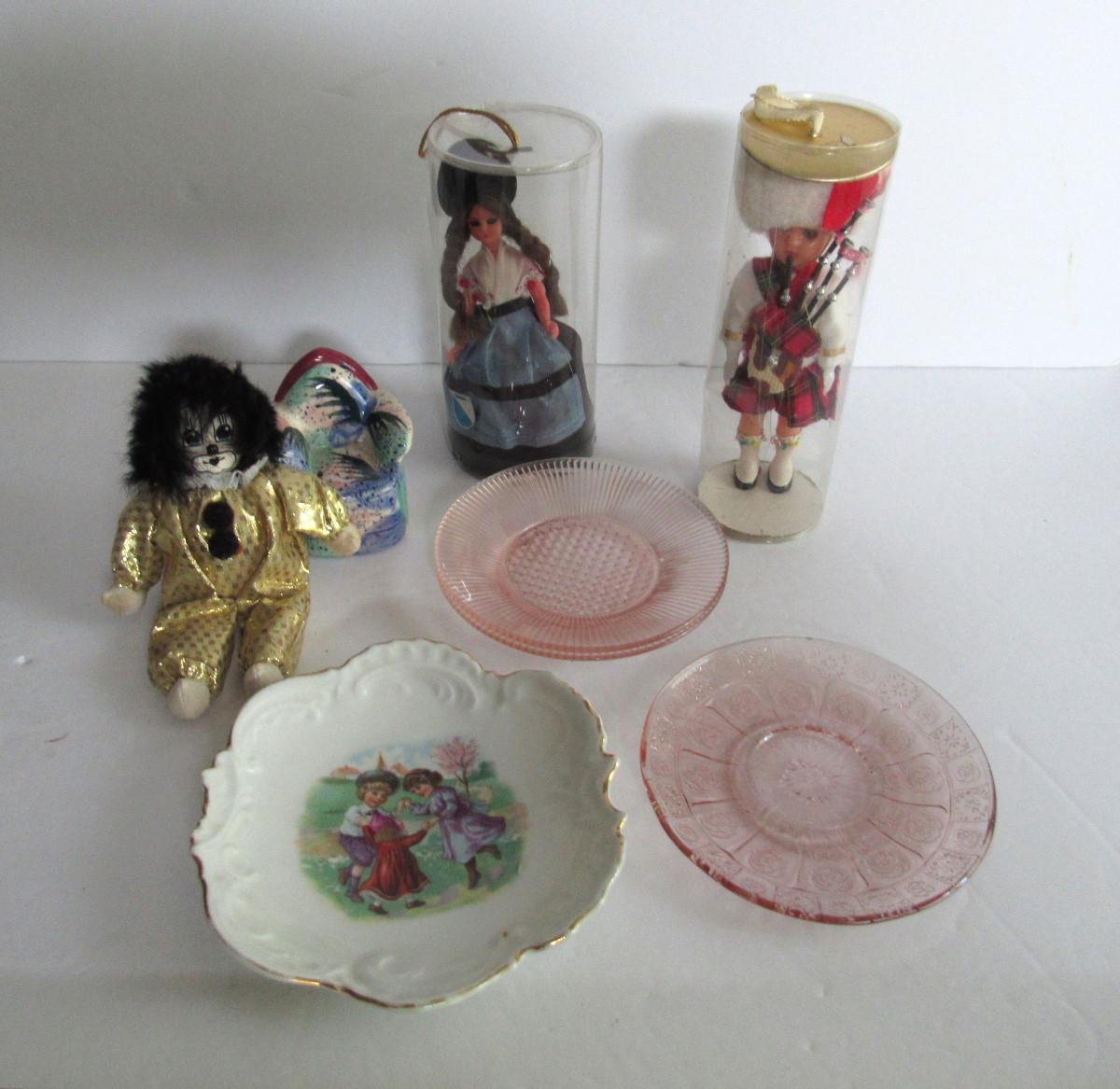 The china and Depression glass kids plates are nice. The ceramic chair is good, clown is good. Dolls are good but the tubes have some damage. Shipping is available at actual shipping cost plus $5.00 handling fee per box for supplies/labor. See our terms for details. All sales are final. Condition notes may not be all inclusive, we may miss some issues as most vintage items are not in mint condition and have some degree of wear, paint loss, etc, but we always try to note obvious damage.