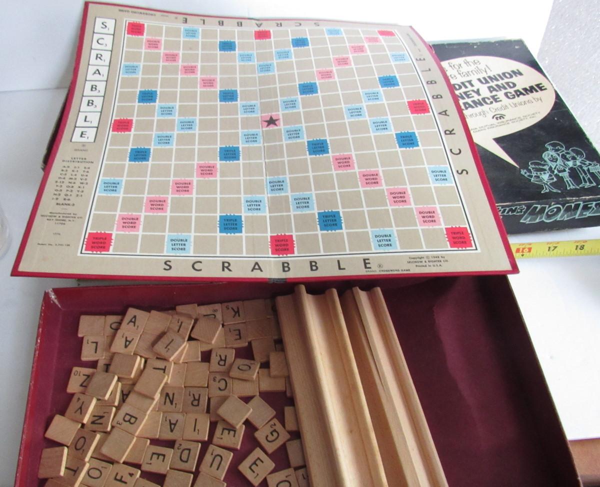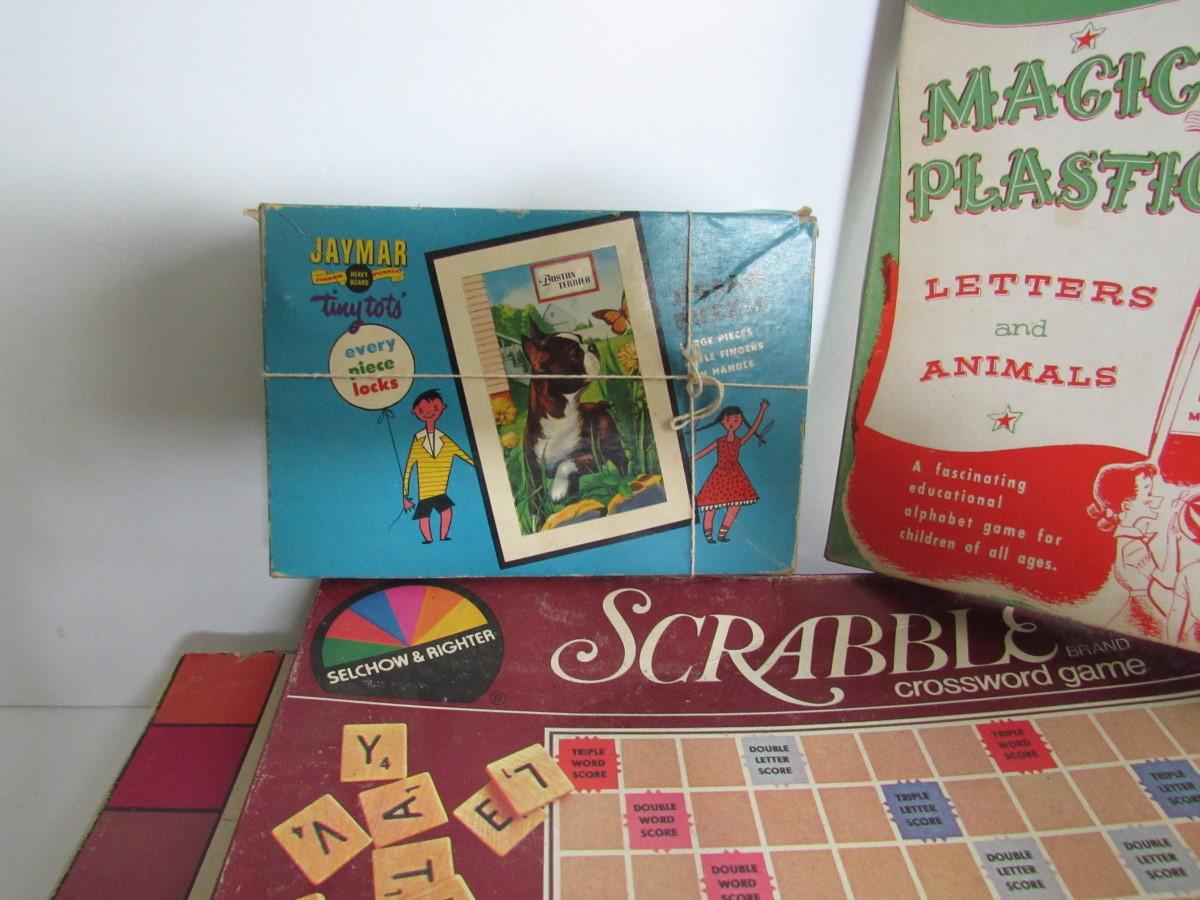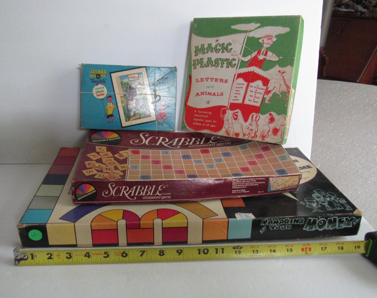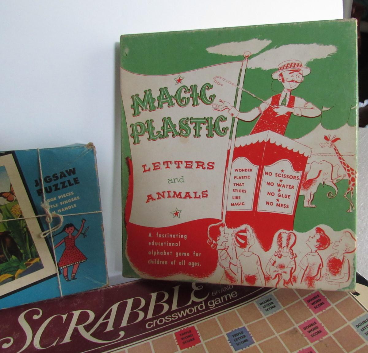 The Scrabble is for parts only, the box and board are bent and mangled. The big one on bottom looks complete or nearly to me but the box is corner tears. The Magic Plastic is like an early Colorforms type toy with little plastic clingy images to adhere to coated squares, may have some pieces missing, but cute.