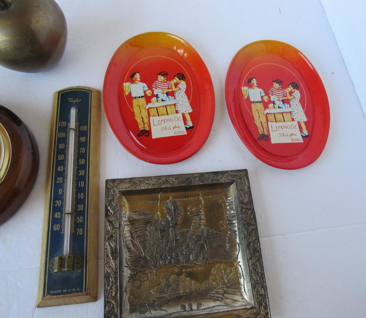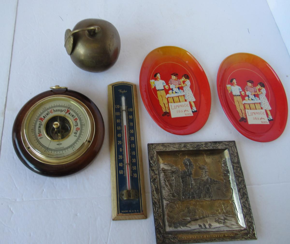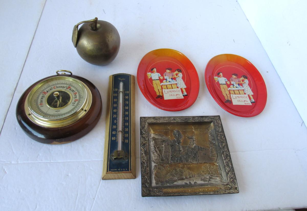 Vintage Rain Guage, Thermometer, Brass Apple, More