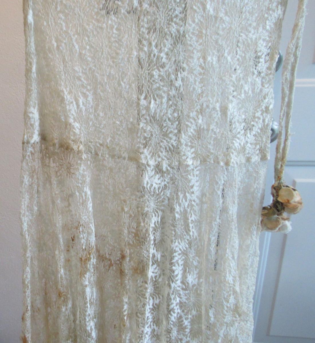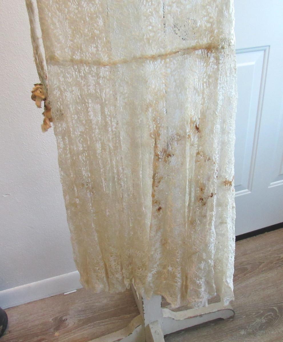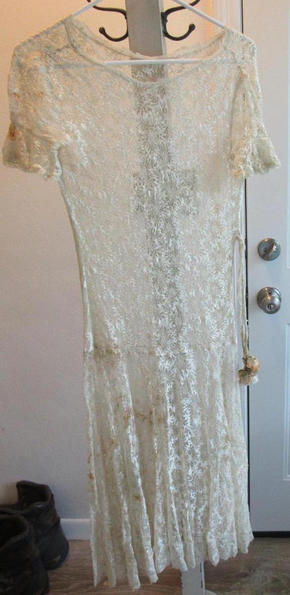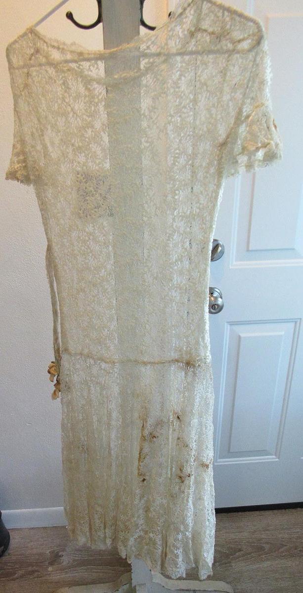 Unfortunately there are dark stains on the off white colored dress. We did not try to clean the stains and have no idea if they will come clean or not. Hoping someone can rescue this very pretty dress. It has short ruffled sleeves. Matching lace belt with flowers on the ends that are as is and need some work. Looks like they may have been attached at some point and can be removed and replaced if desired. Had a drop waist with ruffly flared out lower skirt. Very pretty sheer lace but with the stains. I don't see any holes or tears.Shoulder to shoulder about 18" across, waist about 14" across, shoulder to hem about 45". Shipping is available at actual shipping cost plus $5.00 handling fee per box for supplies/labor. See our terms for details. All sales are final. Condition notes may not be all inclusive, we may miss some issues as most vintage items are not in mint condition and have some degree of wear, paint loss, etc, but we always try to note obvious damage.