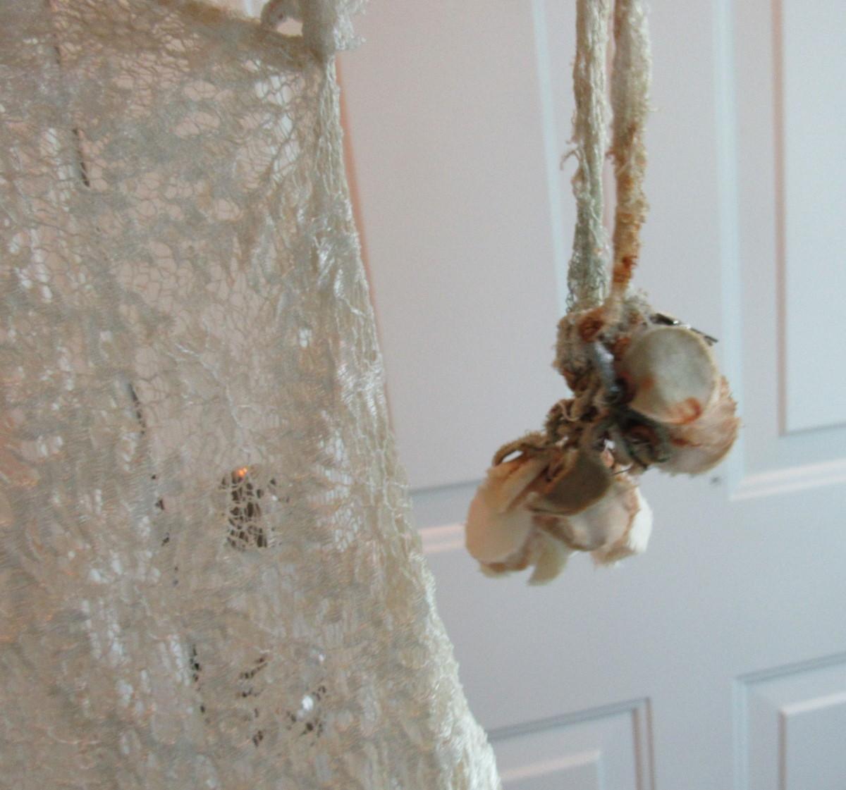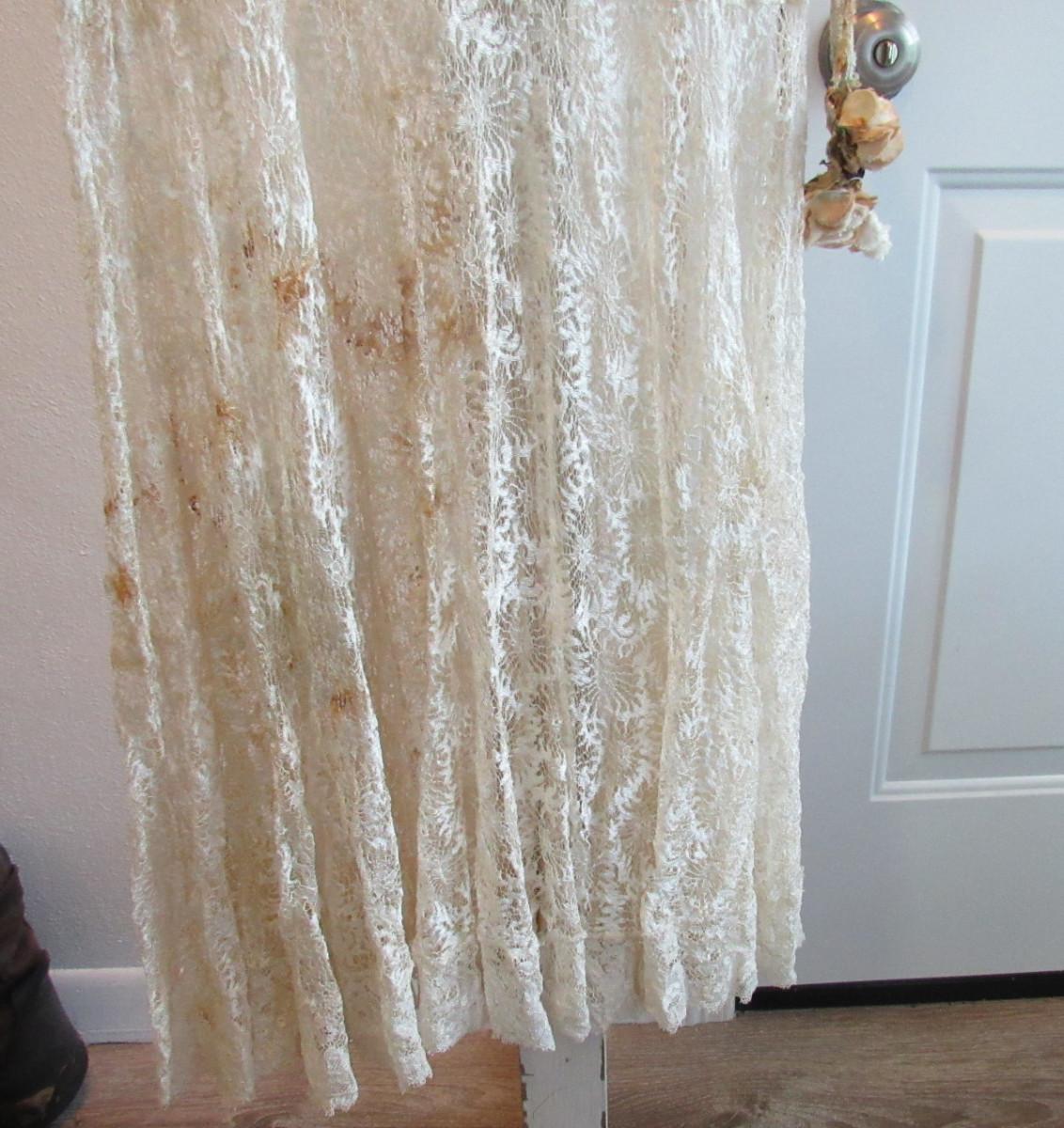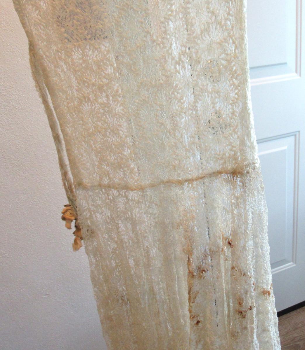 Unfortunately there are dark stains on the off white colored dress. We did not try to clean the stains and have no idea if they will come clean or not. Hoping someone can rescue this very pretty dress. It has short ruffled sleeves. Matching lace belt with flowers on the ends that are as is and need some work. Looks like they may have been attached at some point and can be removed and replaced if desired. Had a drop waist with ruffly flared out lower skirt. Very pretty sheer lace but with the stains. I don't see any holes or tears.Shoulder to shoulder about 18" across, waist about 14" across, shoulder to hem about 45". Shipping is available at actual shipping cost plus $5.00 handling fee per box for supplies/labor. See our terms for details. All sales are final. Condition notes may not be all inclusive, we may miss some issues as most vintage items are not in mint condition and have some degree of wear, paint loss, etc, but we always try to note obvious damage.