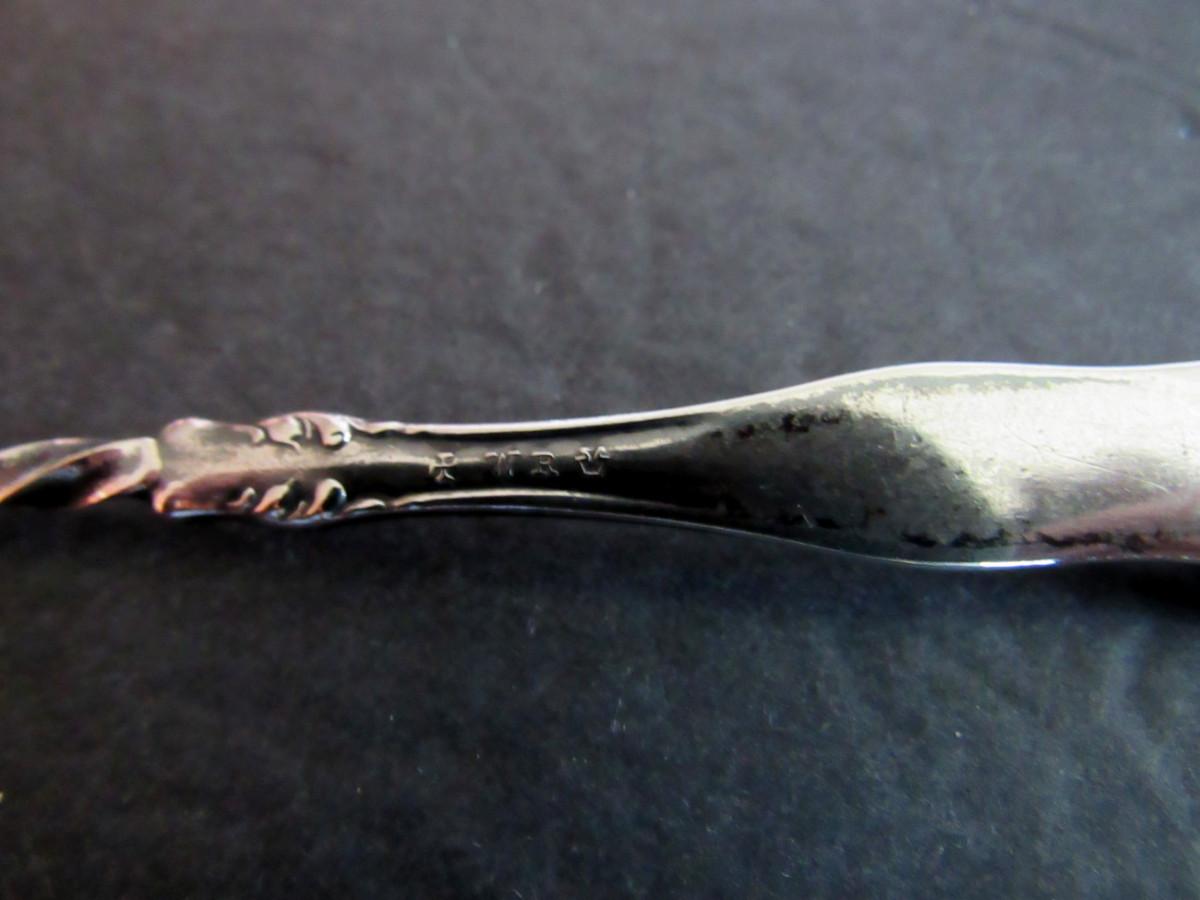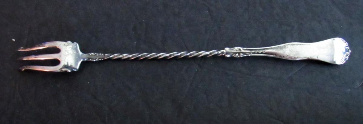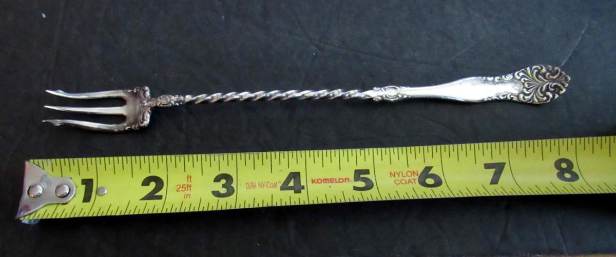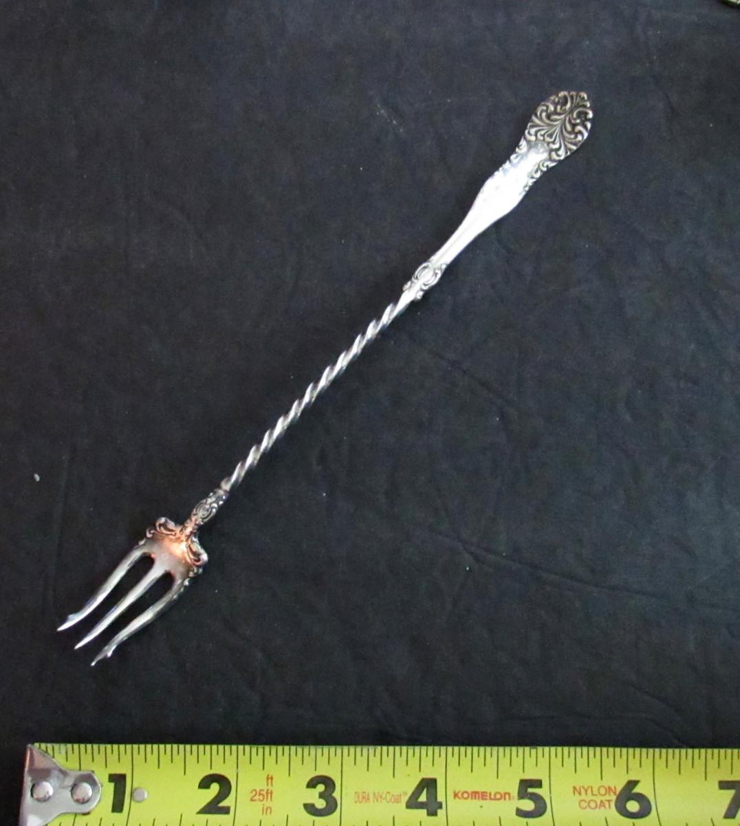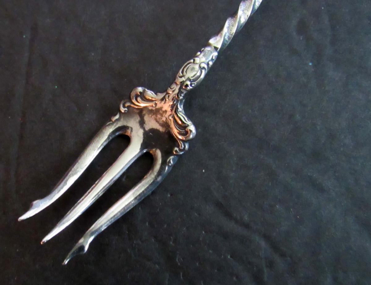 Long silverplate pickle fork. Minor use marks and some wear of the silver on back. Marked on back. Shipping is available at actual shipping cost plus $5.00 handling fee per box for supplies/labor. See our terms for details. All sales are final. Condition notes may not be all inclusive, we may miss some issues as most vintage items are not in mint condition and have some degree of wear, paint loss, etc, but we always try to note obvious damage.