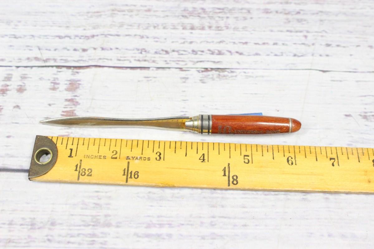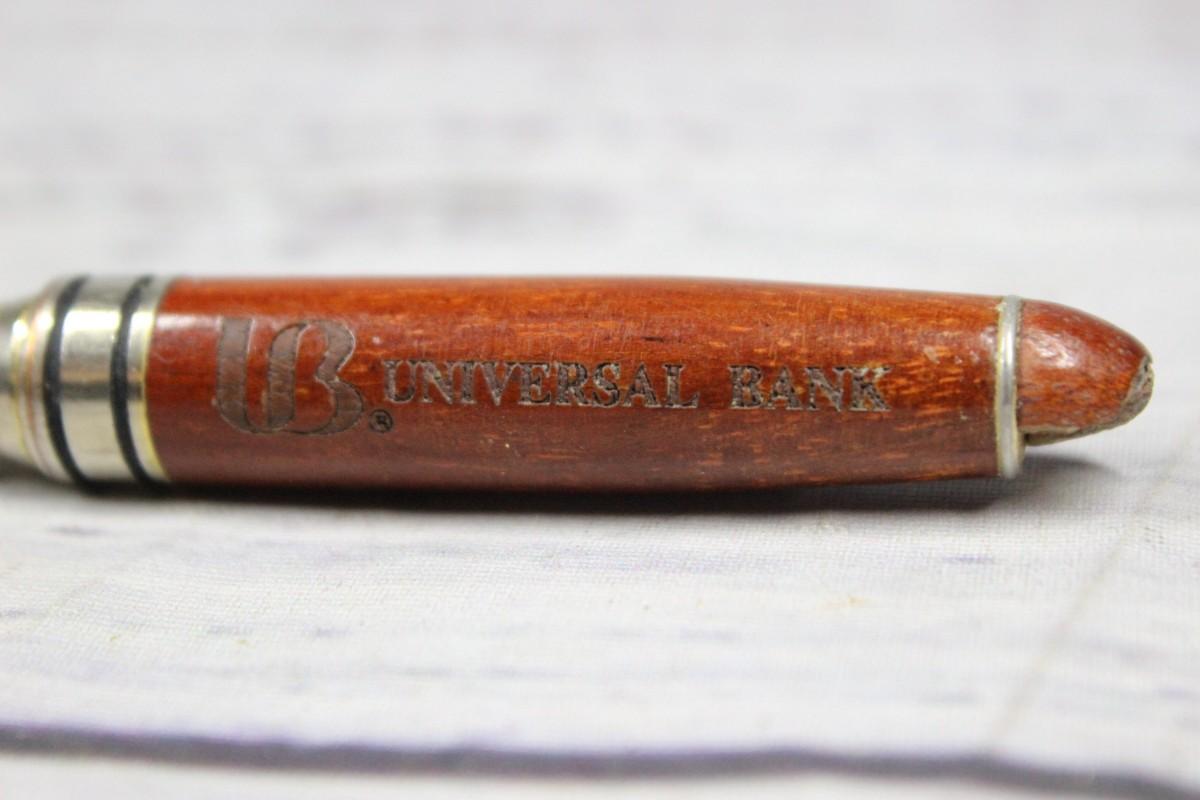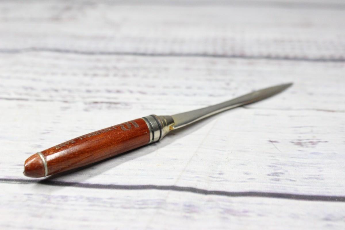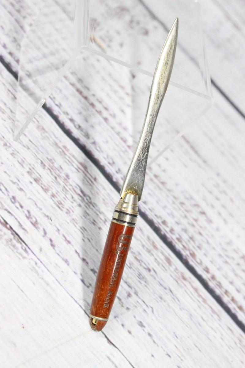 Vintage Universal Bank Letter Opener, there is some wear to letter opener. There's a chip on the handle of the opener, see pictures for more information and for sizing.