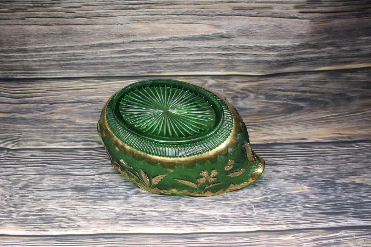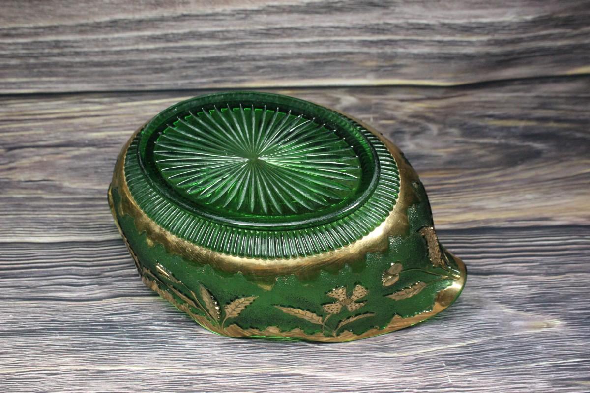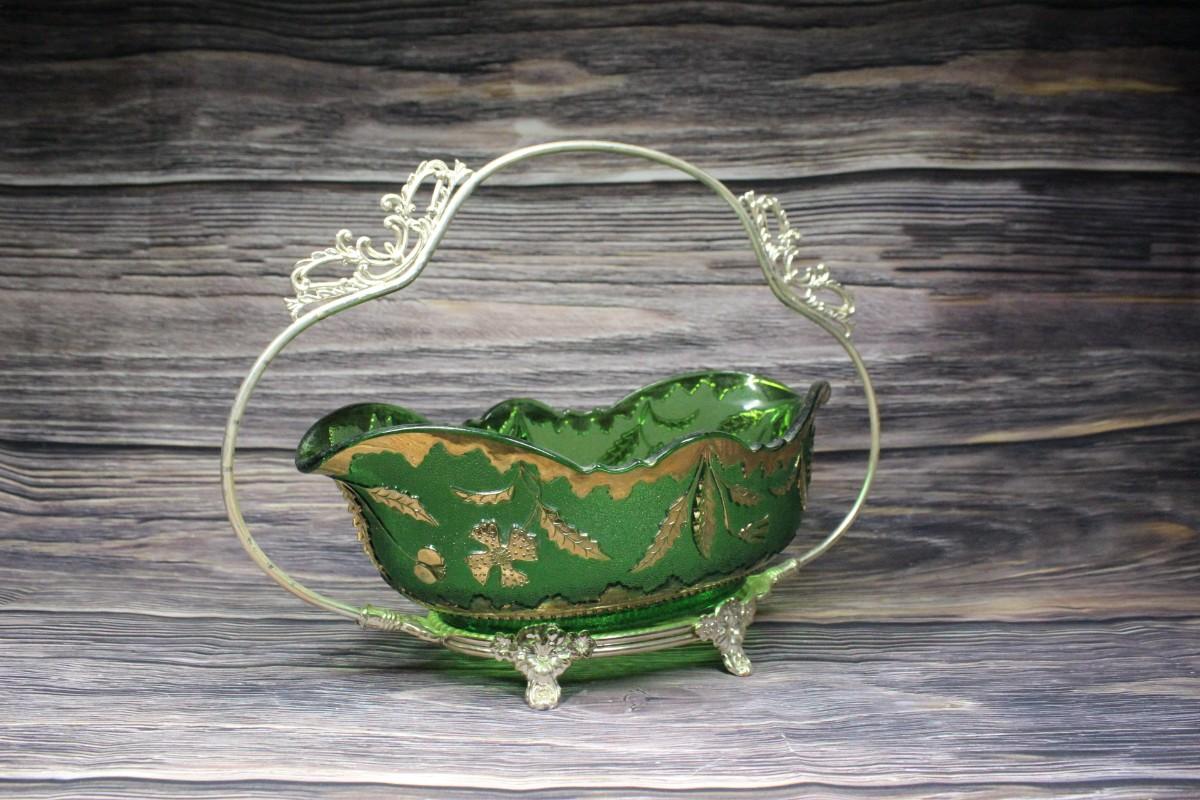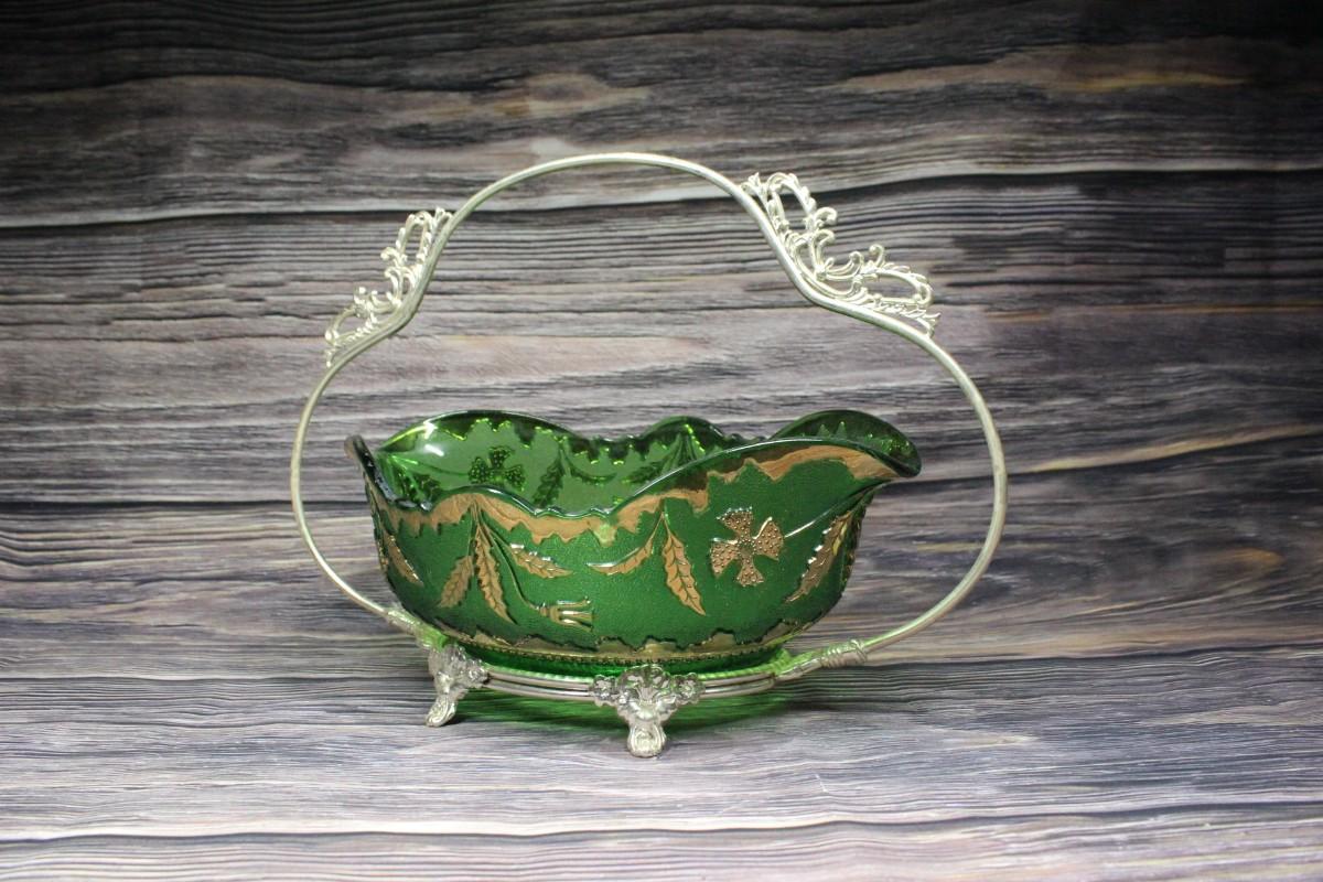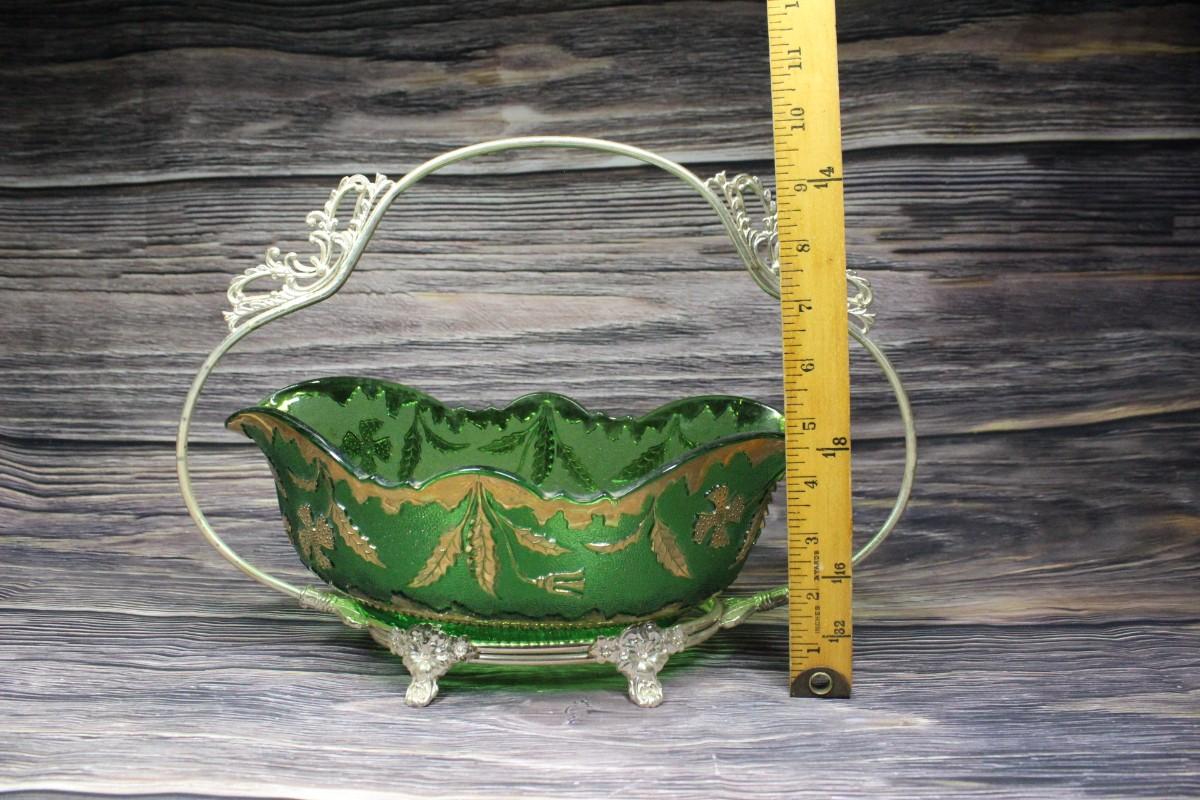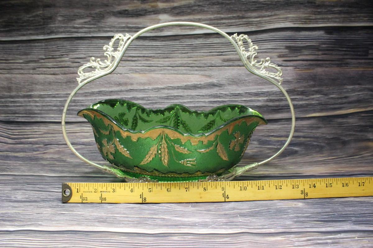 Vintage green glass serving bowl. Green with gold gilt details. Sits in a silvertone metal basket handle. No chips. Light wear to gold gilt.