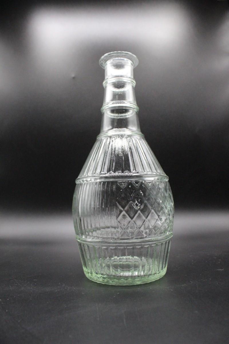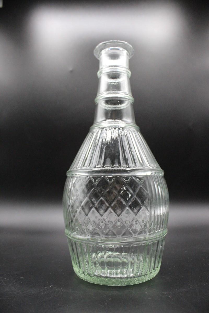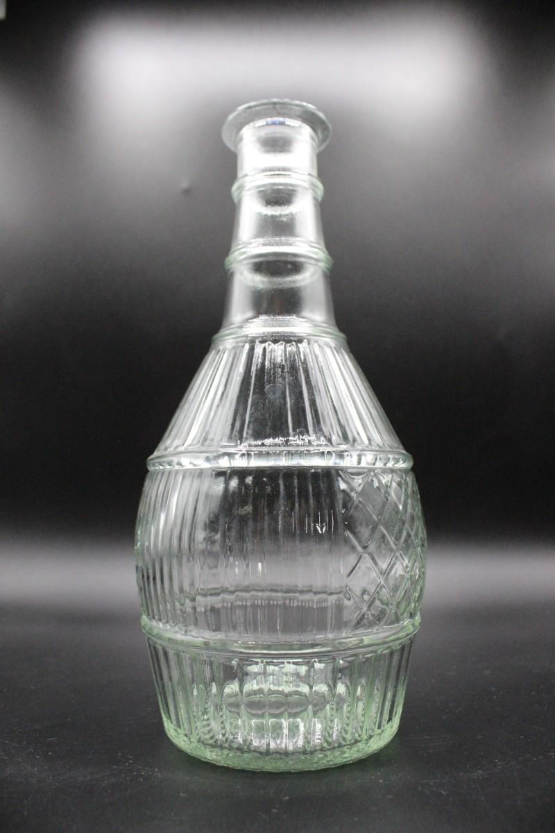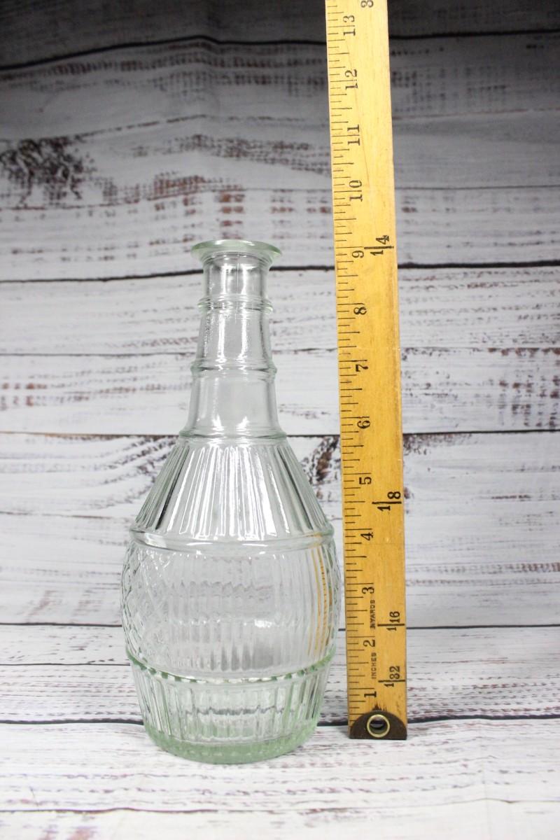 Vintage genie style glass bottle. Has a slight greenish tint to the clear glass. Good condition. No stopper or cap. 9" size.