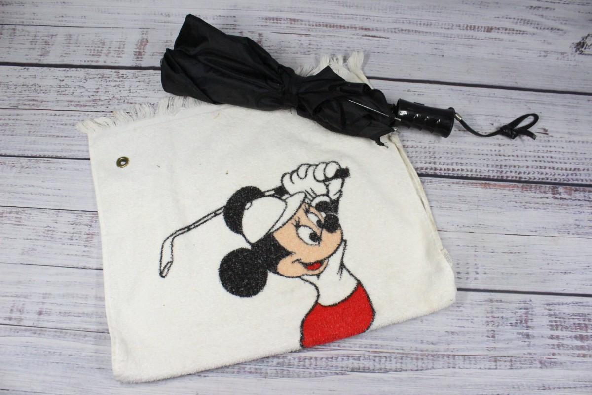 Retro Miscellaneous Disney Memorabilia, comes with a compact travel umbrella, 3 paddle ball toys, a golf themed towel, and a wooden 101 Dalmatians wind chime.