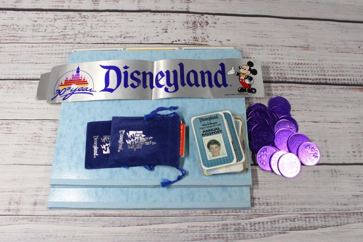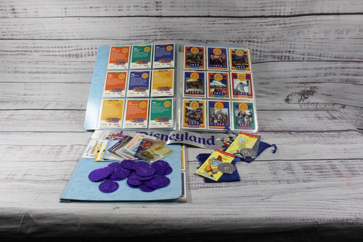 Vintage Disneyland Collectors Series Trading Cards and Other Collectible Memorabilia, comes with two folders of organized Disney collector series trading cards, memorabilia coins, an unused bumper sticker, and personal annual pass holder items. There's no significant damage to any of the pieces or cards and is in good condition.
