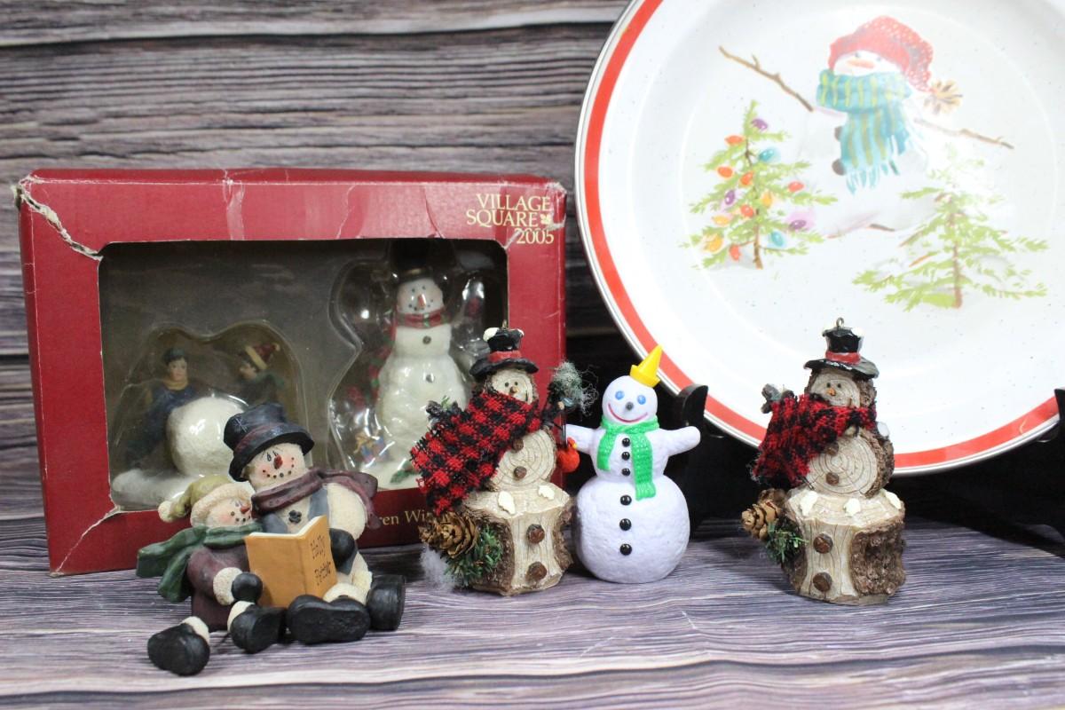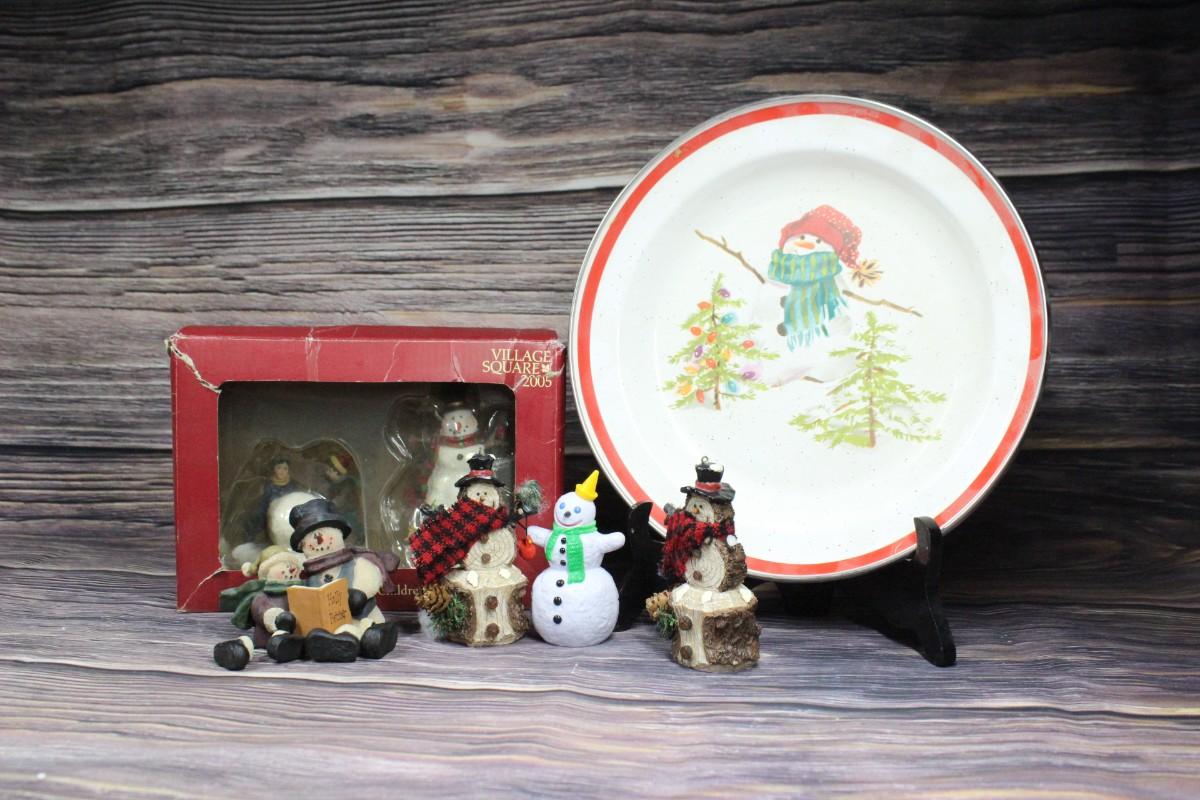 Vintage Christmas Snowman Home Decor Lot, comes with snowman themed Christmas tree decorations, toy, and plate. Check pictures for more details.