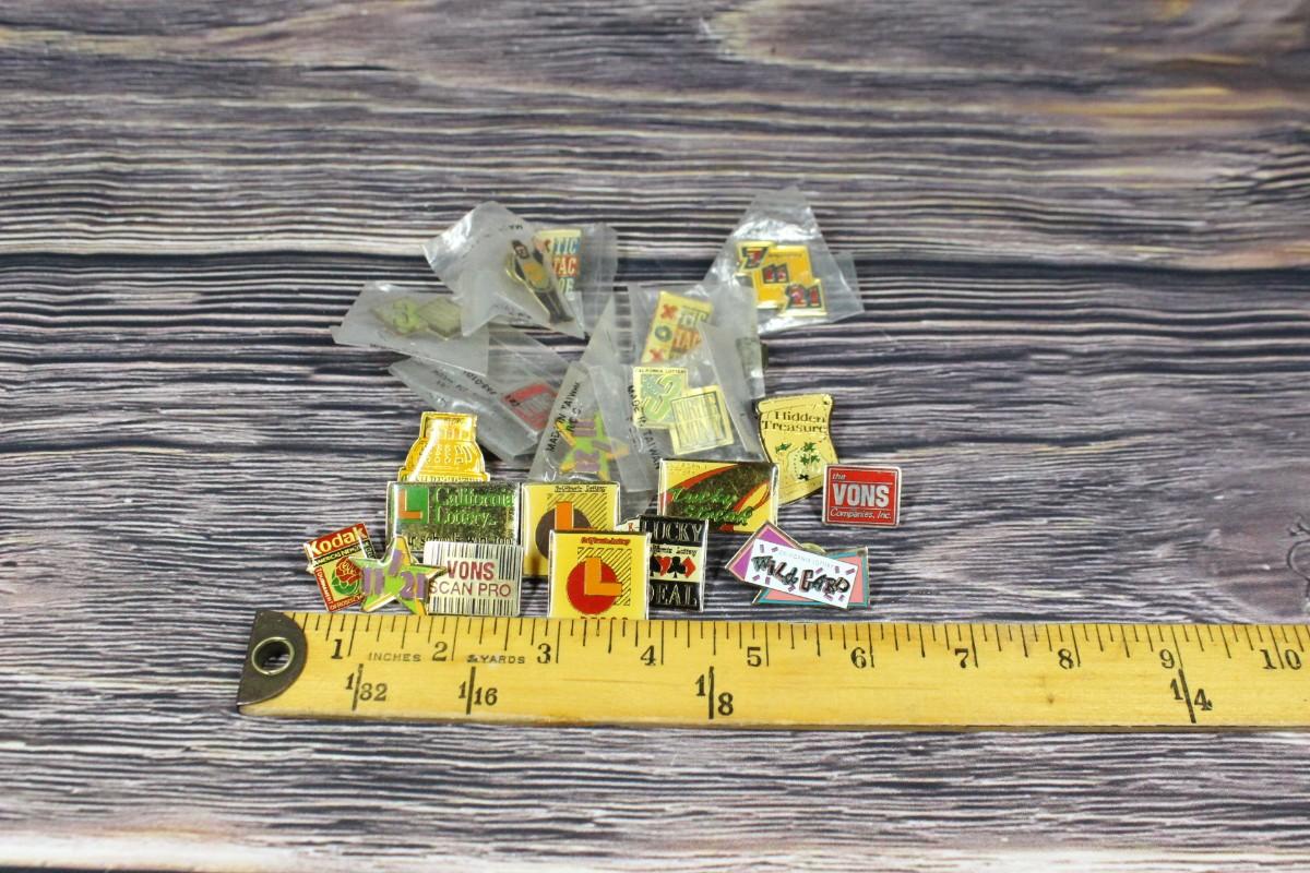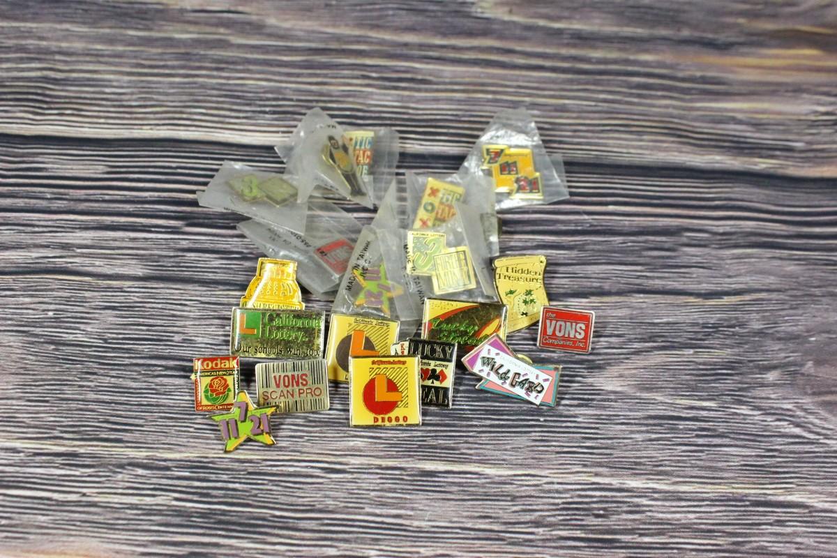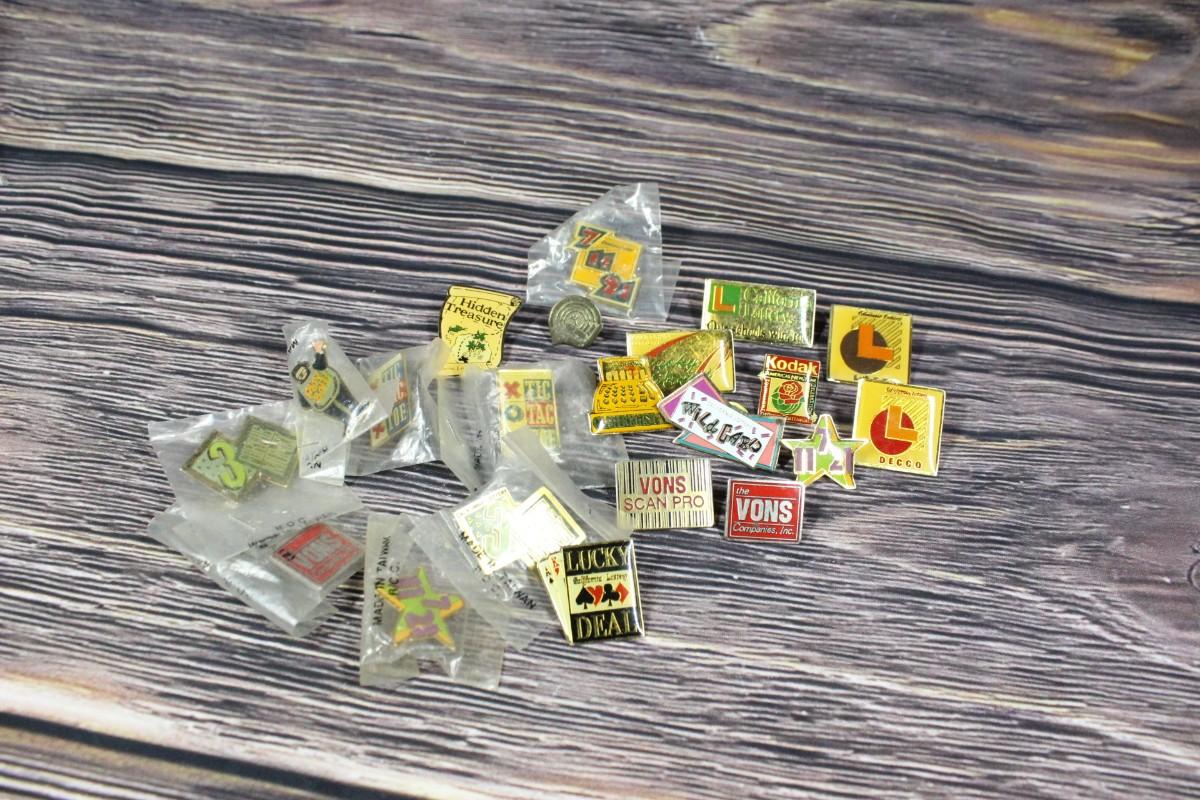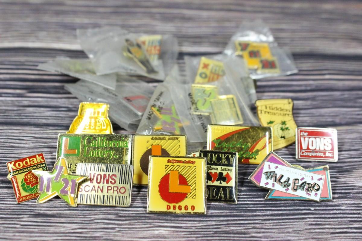 Vintage Collectible California Lottery Grocery Store Pins, some are still sealed and some are opened. There's no significant damage to any of the pins and is in good vintage condition. See pictures for more details.