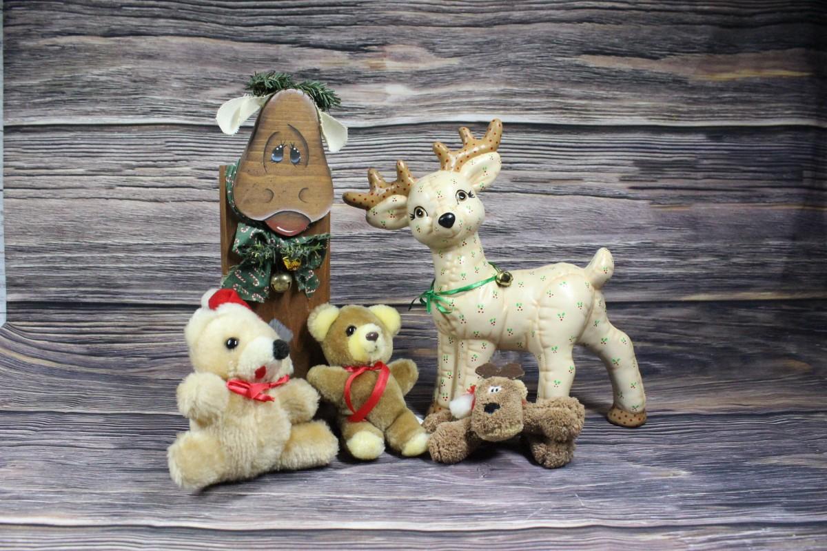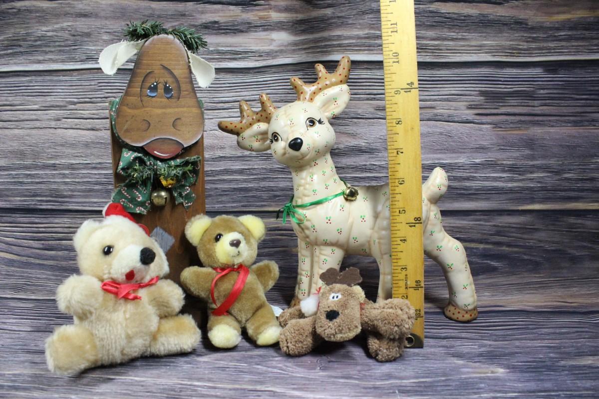Christmas Reindeer Stuffed Animal Miscellaneous Decorations Lot, there's no significant damage or chips to any of the pieces and is in good condition. Check pictures for more details.