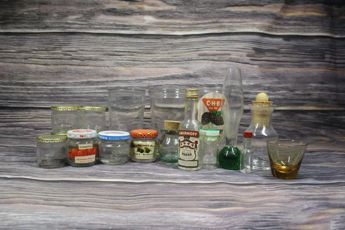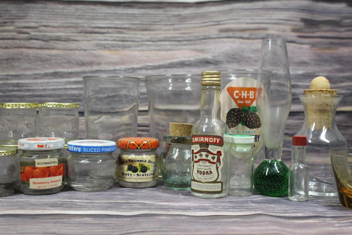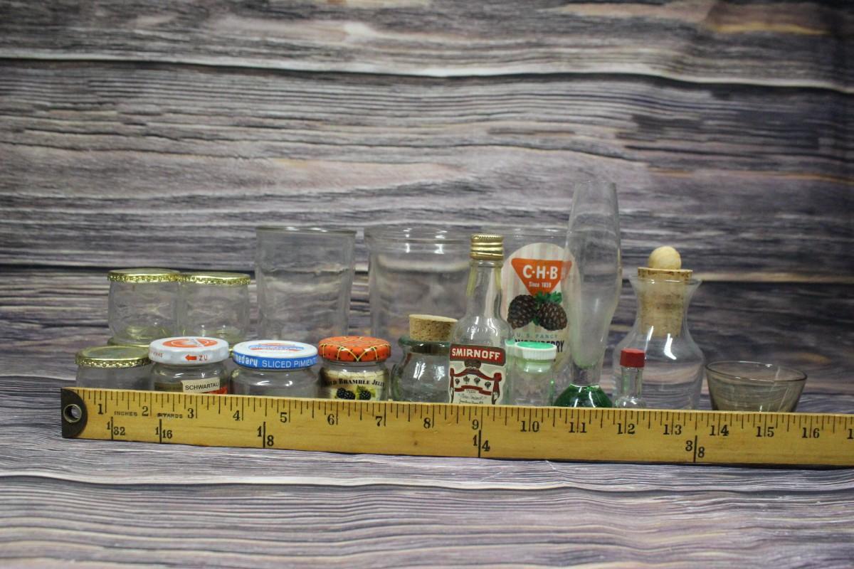 Vintage Glass Jars Bottles and Cups, there's no significant chips or cracks to the pieces and is in good vintage condition. Check pictures for more details and for sizing.