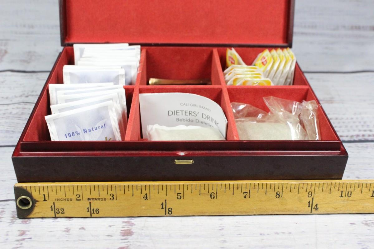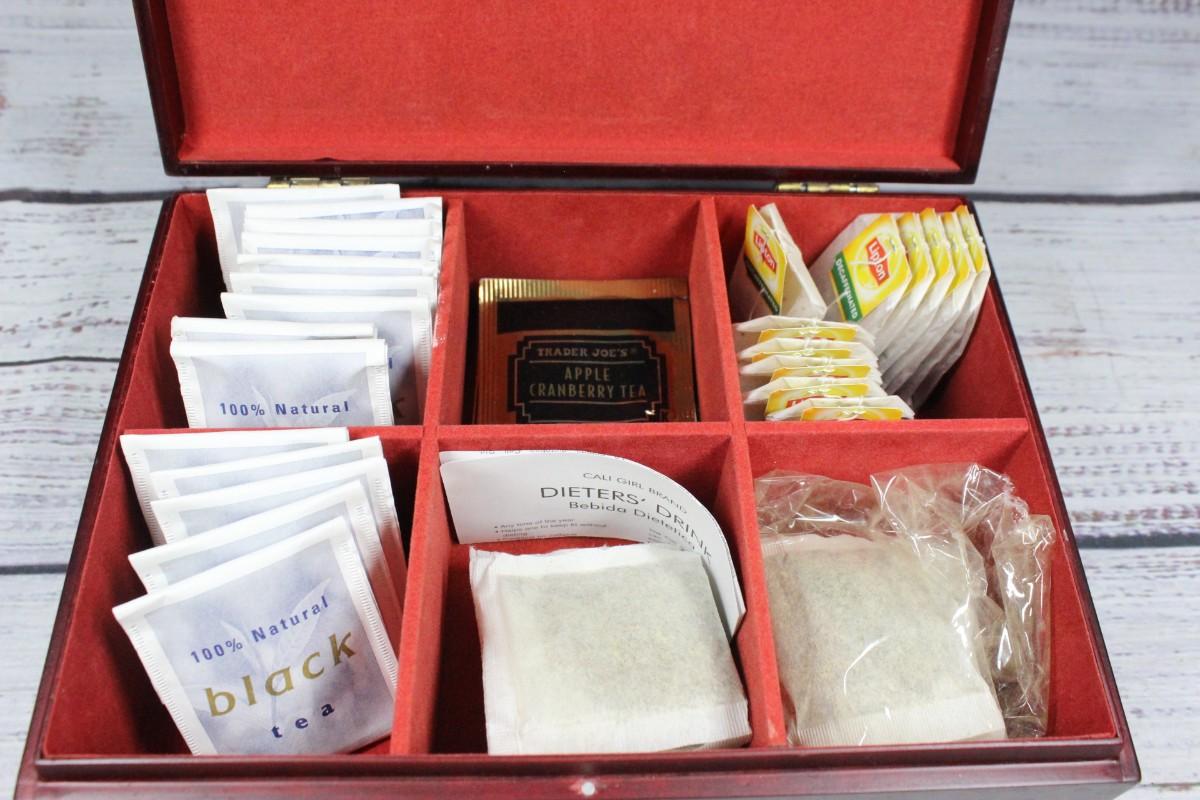 Bentley's Finest Tea Box with Various Kinds of Teas, this box comes with different kinds of teas. There is no significant damage to the box. Check pictures for more details and for sizing. Not sure about tea bag ages, expirations