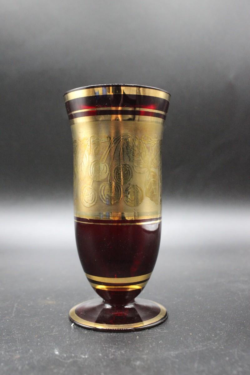 Vintage Made in Czechoslovakia Red and Gold Drinking Glass. Cherry fruit pattern in the gold band around the glass there's no significant chips or cracks to the glass and is in good vintage condition. Check pictures for more details and for sizing.