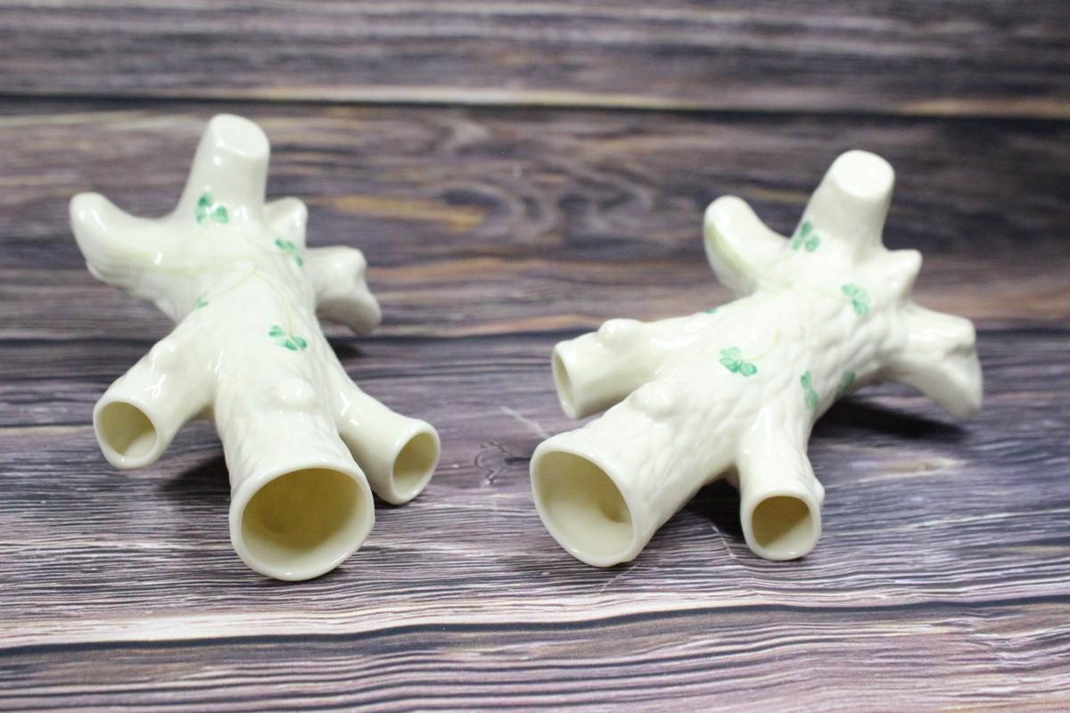 Vintage Pair of Belleek Shamrock Tree Trunk Vase Candleholders