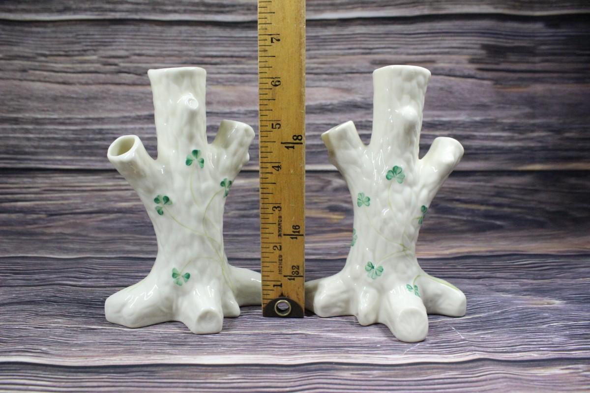 Vintage Pair of Belleek  Shamrock Tree Trunk Vase Candleholders