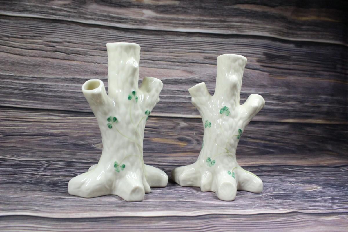 Vintage Belleek Shamrock Tree Trunk Vase Candleholders, there's no significant cracks or chips to both pieces and is in good condition. Check pictures for more details and for sizing. Belleek green mark on the bottom.