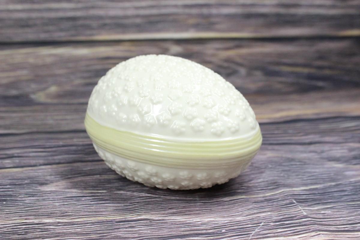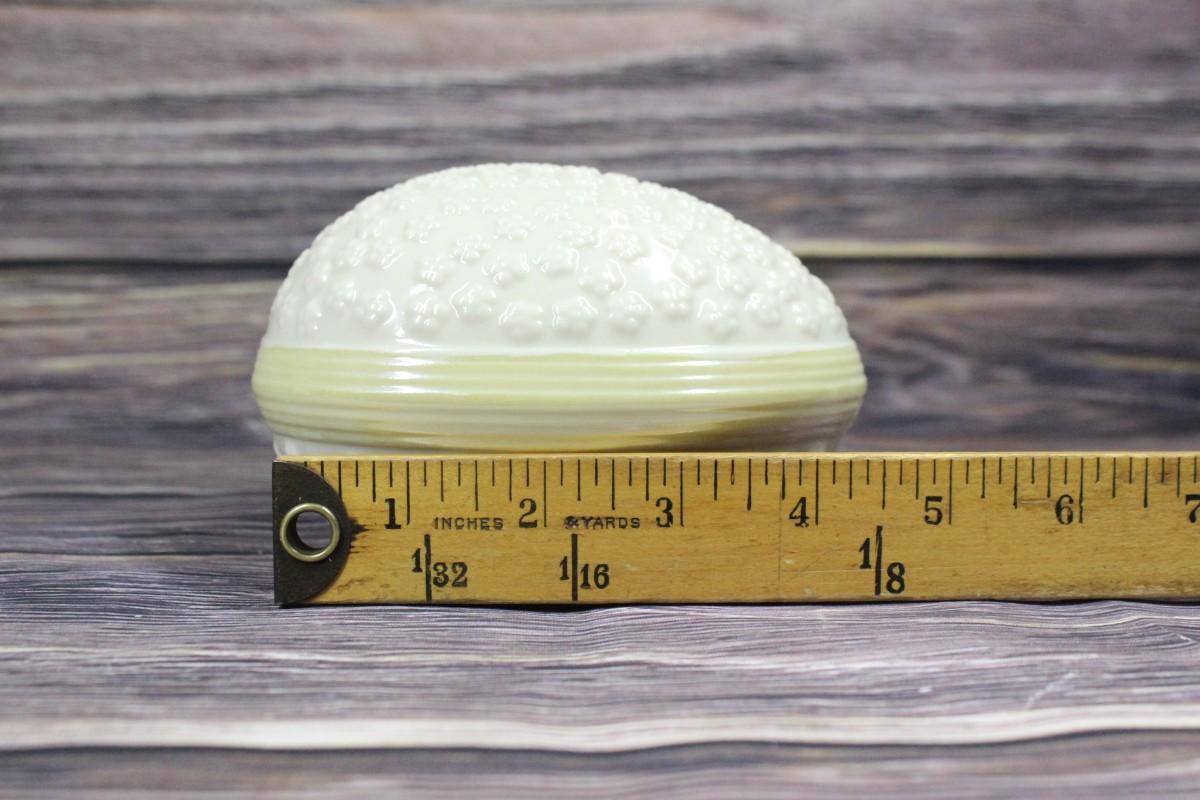 Vintage Belleek Lustre Ware Egg Embossed with Daisies and Yellow Trim, there are no cracks or chips to the egg and is in good condition. Check pictures for more details and for sizing.