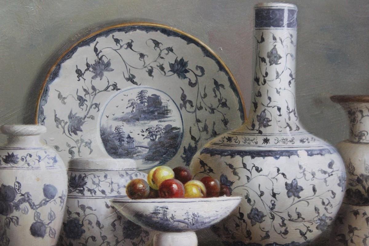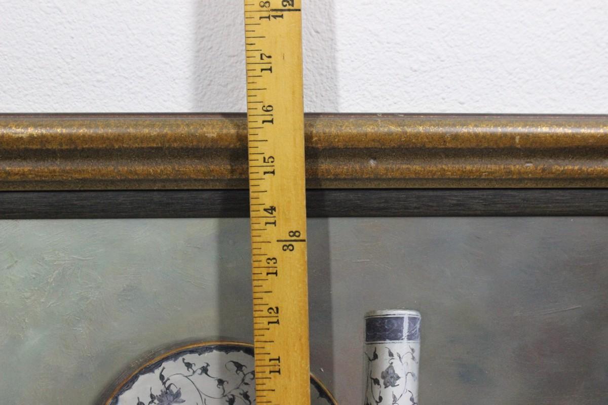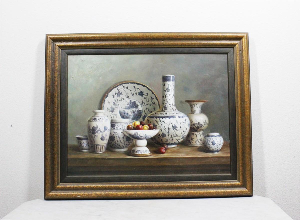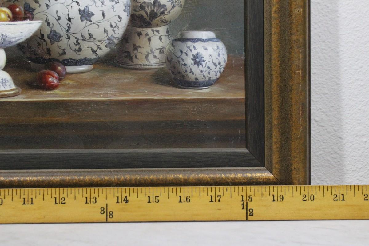 Vintage Framed Still Life Oil Painting Blue & White China on Shelf