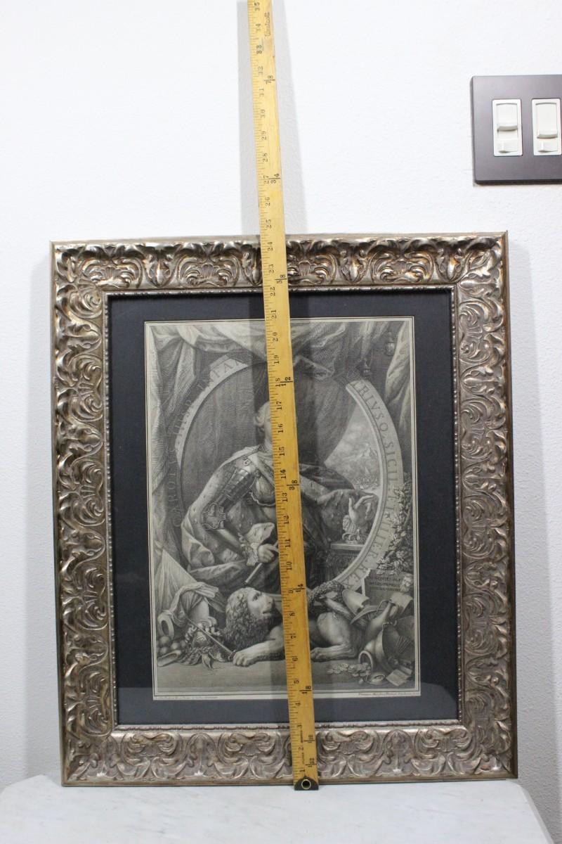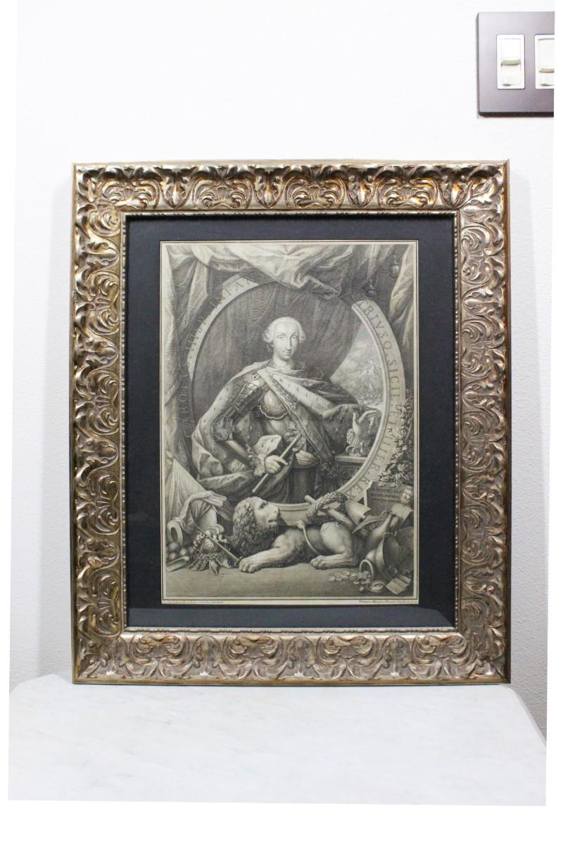Vintage Framed Print of Charles III of Bourbon by Filippo Morghen, there are no cracks or chips to the frame or protective glass and is in good condition. Check pictures for more details and for sizing. Print originally from the book Le pitture Antiche D'Ercolano 1765.