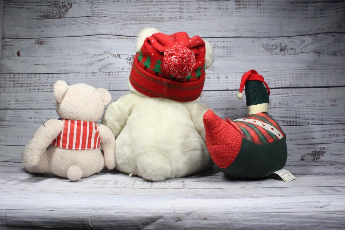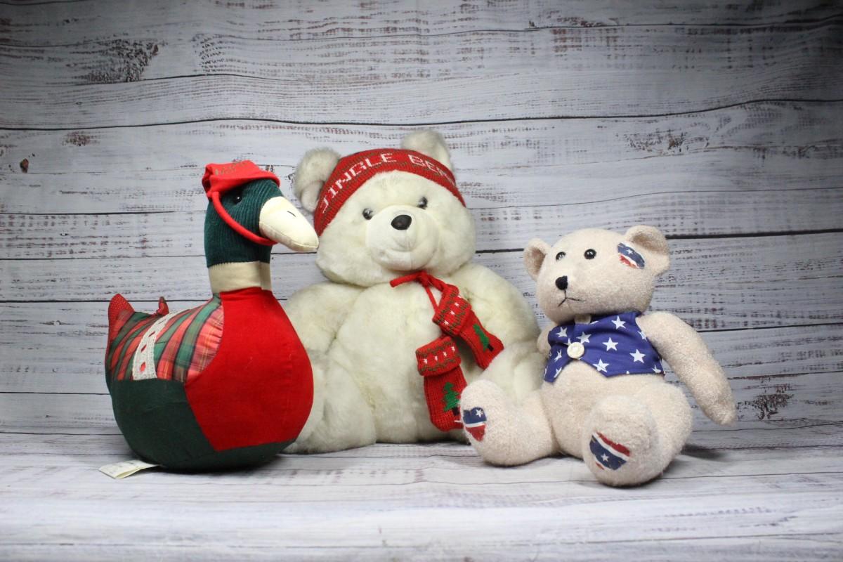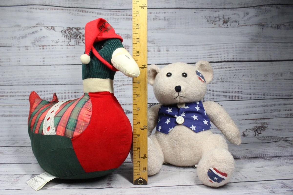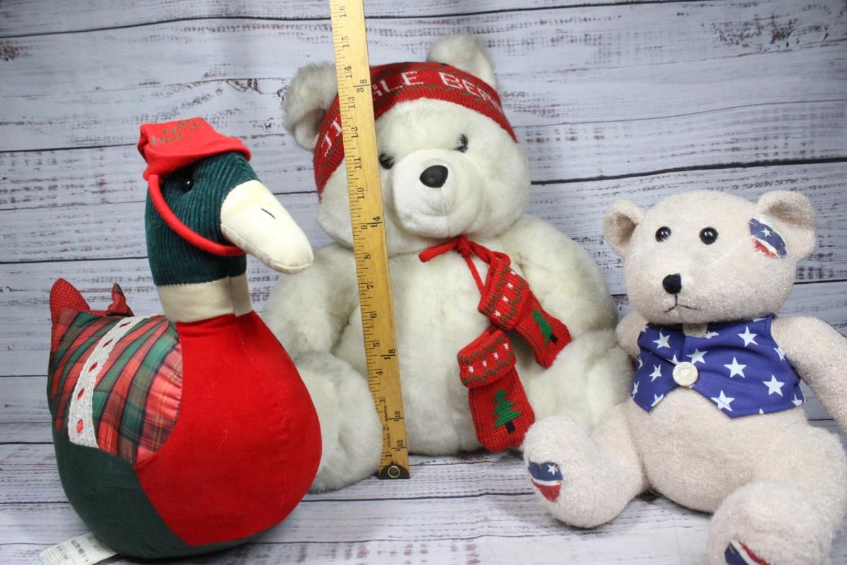 Christmas and Patriotic Themed Stuffed Animals, there are no cracks or chips to any of the stuffed animals and is in good condition. Check pictures for more details and for sizing.