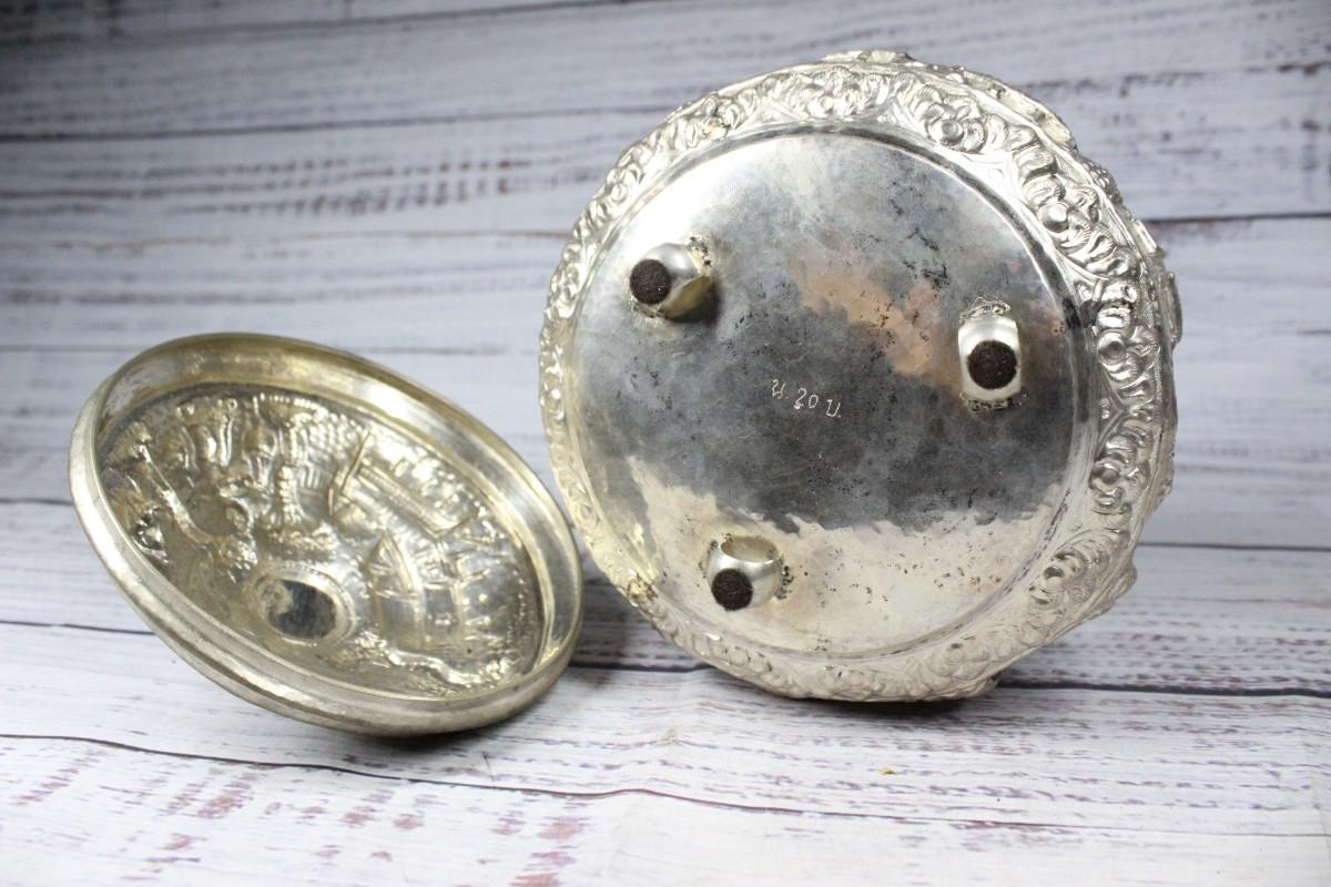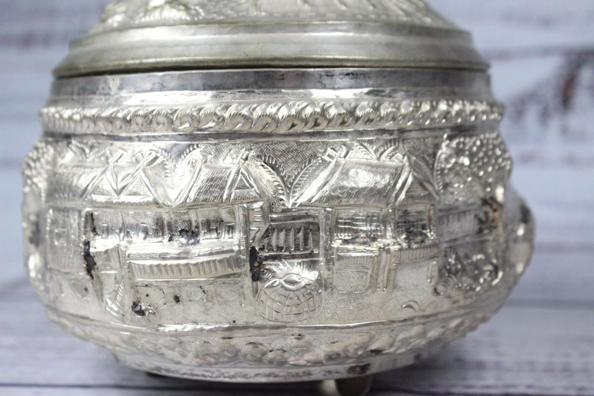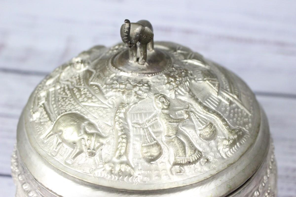 Vintage Repousse Ornate Oriental Lidded Canister. Stamped pattern features people an animals, elephant on top of lid. No sterling marks. Hammered and embossed design. There is some vintage wear to the metal, but there is no significant dents or chips to the piece and is in overall good condition. Check pictures for more details and for sizing. Large almost 8" size.