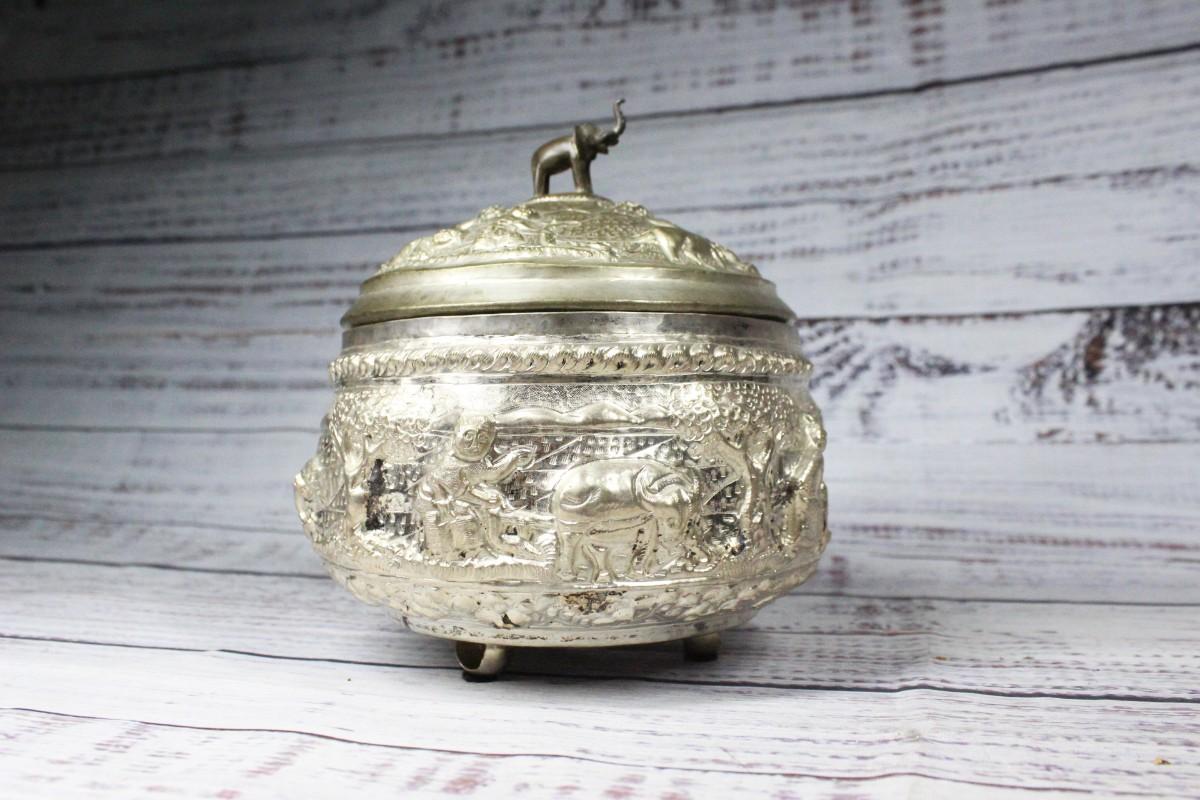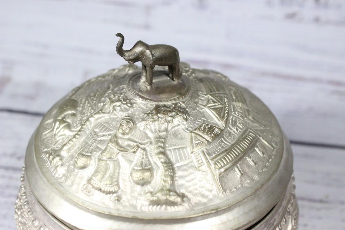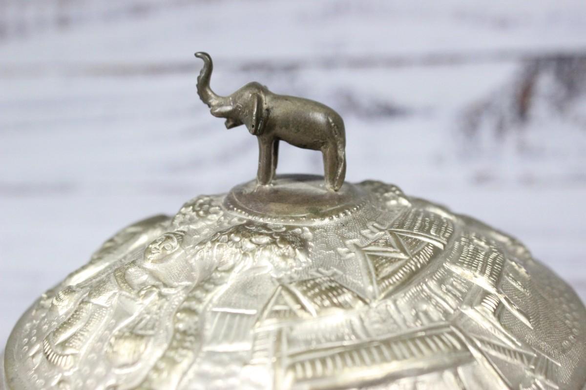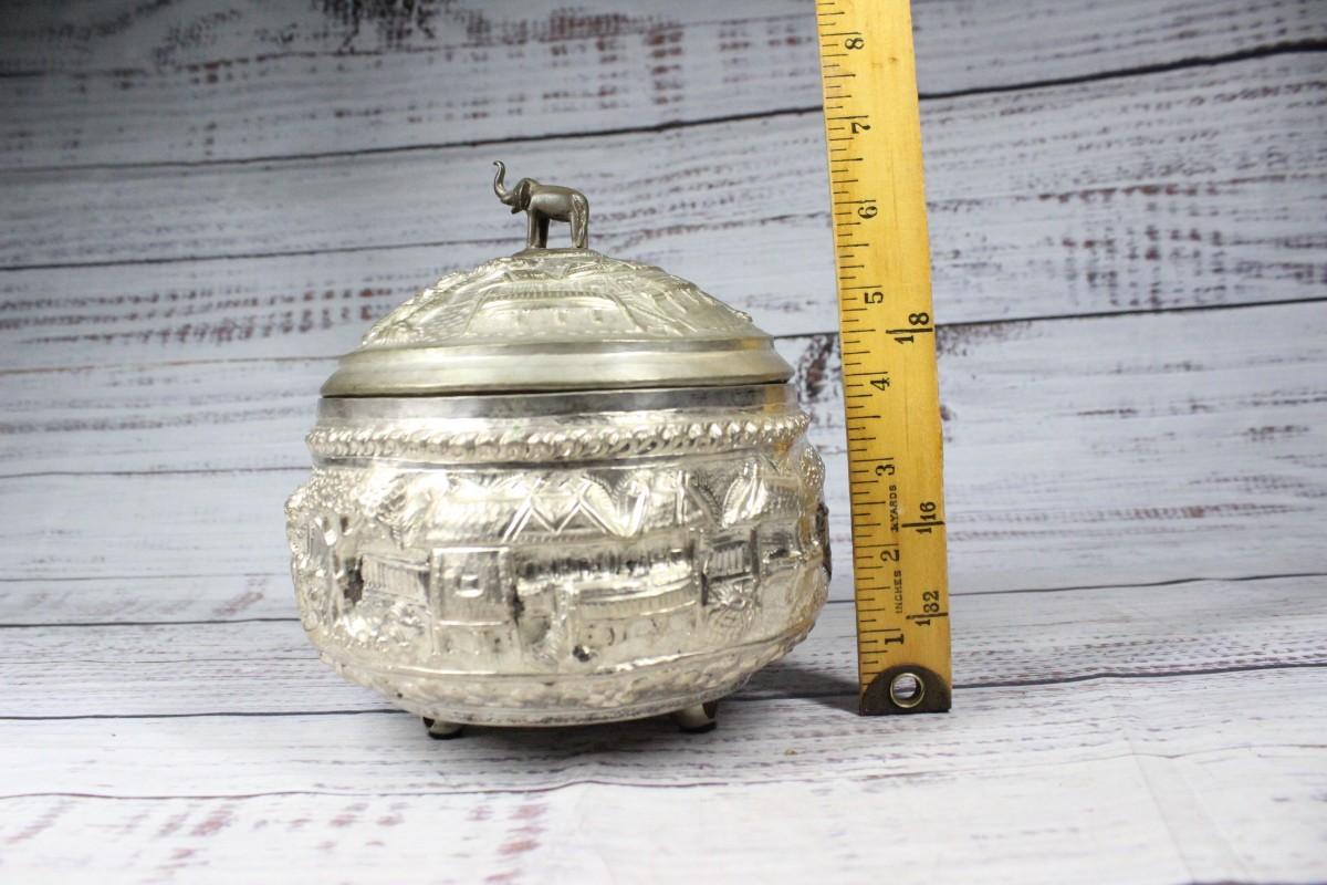 Vintage Repousse Stamped Hammered Ornate Oriental Lidded Elephant Bowl Canister