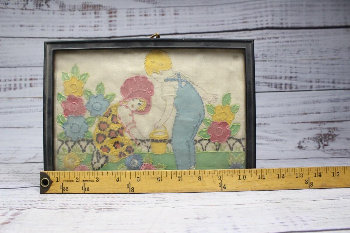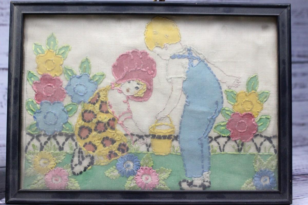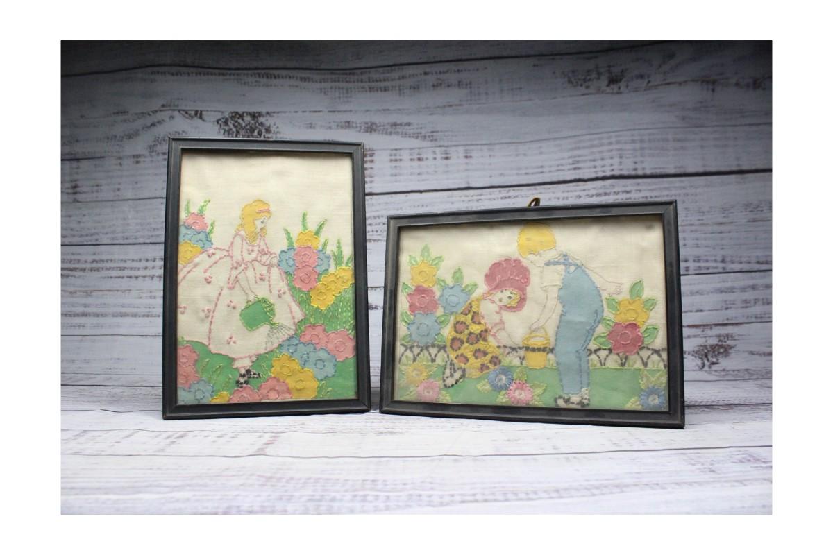 Pair of Vintage Framed Cross Stitch Art, there's no cracks or chips to the frame or protective glass and is in good vintage condition. Glass and frame needs to be cleaned, check pictures for more details and for sizing.