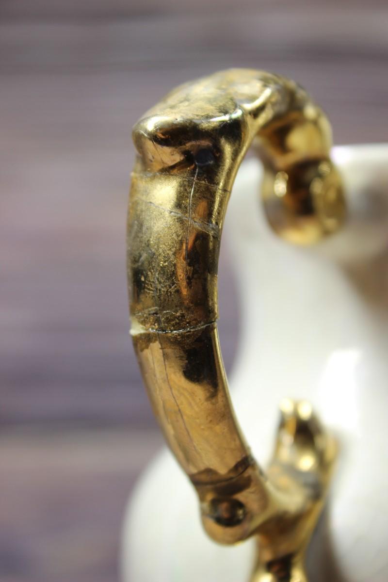 Vintage Royal Ceramic White & Gold Teapot and Cream Pitcher, there is some vintage wear on both piece and the handle of the cream pitcher has been repaired before. There is no other significant damage to the pieces, check pictures for more details and for sizing. There is a maker mark engraved on the bottom of each piece with the initials JT.
